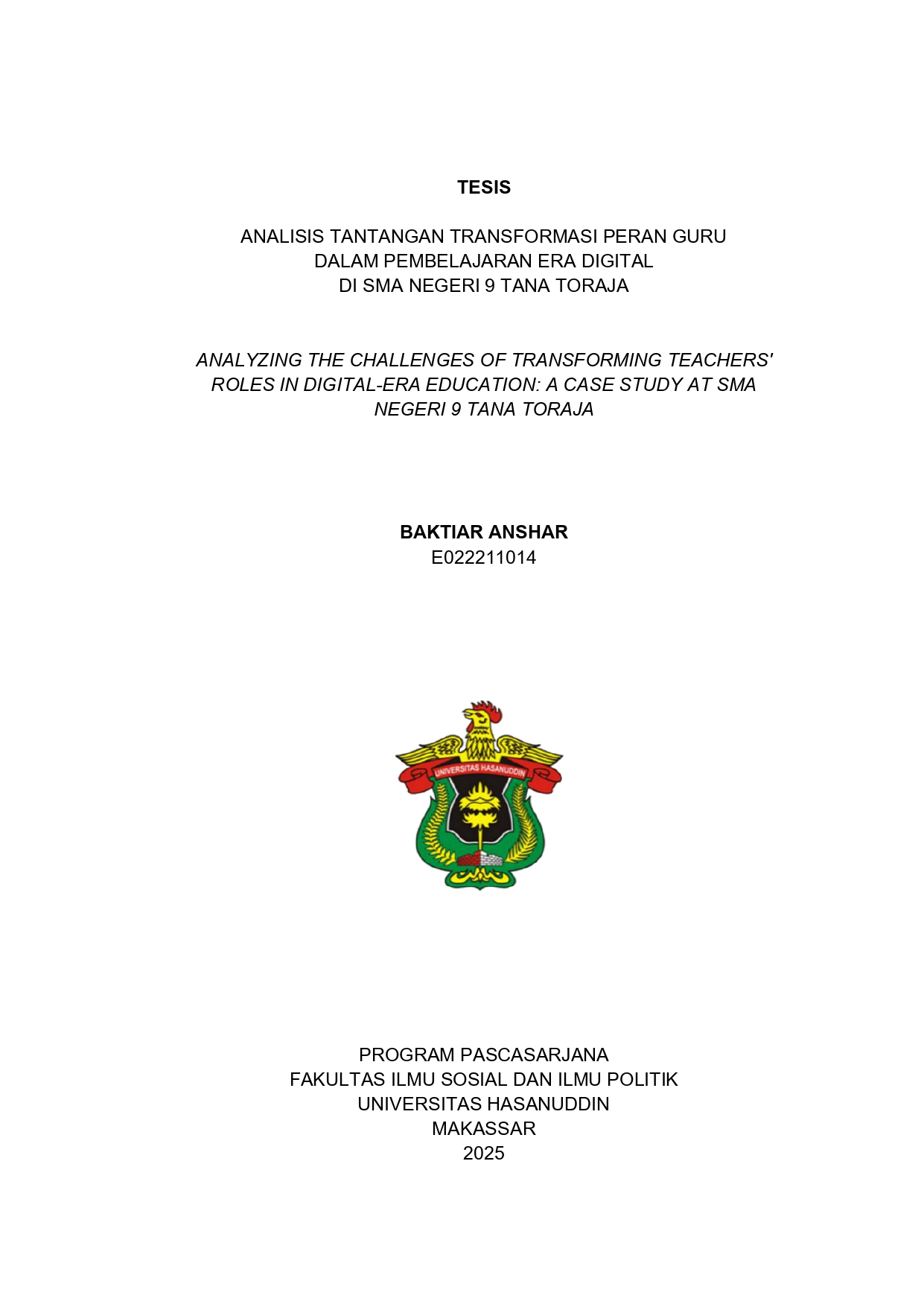 ANSHAR, BAKTIAR (2025) Analisis Tantangan Transformasi Peran Guru dalam Pembelajaran Era Digital di SMA Negeri 9 Tana Toraja = Analyzing The Challenges of Transforming Teachers' Roles In Digital-Era Education: A Case Study At SMA Negeri 9 Tana Toraja. Thesis thesis, Universitas Hasanuddin.