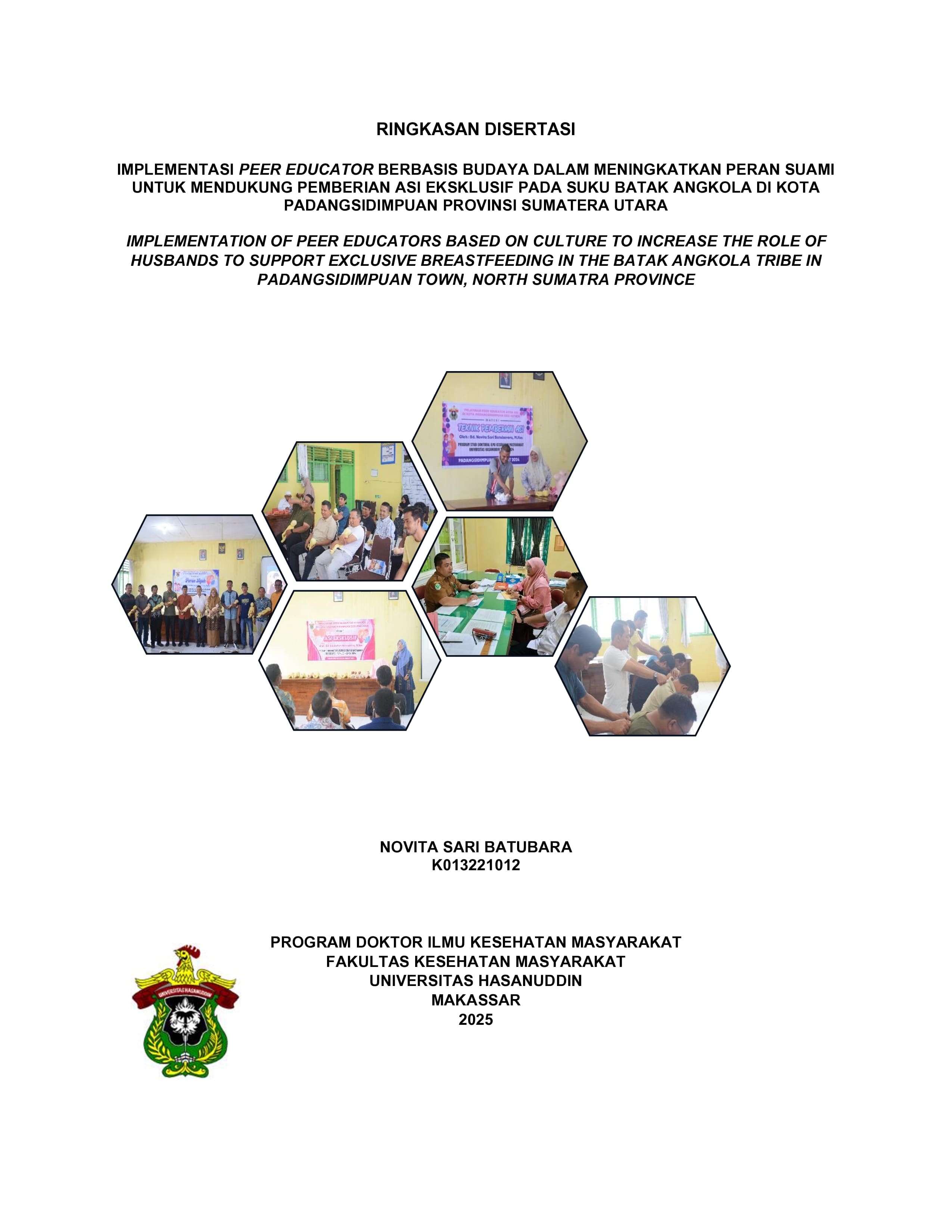 NOVITA SARI BATUBARA. Implementasi Peer Educator Berbasis Budaya Dalam Meningkatkan Peran Suami Untuk Mendukung Pemberian ASI Eksklusif Pada Suku Batak Angkola Di Kota Padangsidimpuan Provinsi Sumatera Utara (Dibimbing oleh A. Ummu Salmah, Rahayu Indriasari, Wahiduddin) Pemberian ASI eksklusif selama enam bulan pertama belum mencapai target nasional, terutama pada masyarakat dengan budaya seperti suku batak Angkola, yang membatasi peran dan komunikasi istri terkait menyusui. Untuk menjawab tantangan ini, diperlukan pendekatan edukatif berbasis budaya yang mampu meningkatkan keterlibatan suami, salah satunya melalui pengembangan dan implementasi peer educator ayah ASI. Metode penelitian ini adalah mixed method explanatory sequential, dimulai dengan pendekatan kualitatif melalui wawancara mendalam terhadap tokoh adat, masyarakat, agama, dan suami di Kota Padangsidimpuan untuk eksplorasi budaya dan kebutuhan edukasi. Hasil kualitatif digunakan sebagai dasar pengembangan modul yang kemudian divalidasi oleh ahli dan calon pengguna secara deskriptif. Tahap kuantitatif menggunakan desain quasi-eksperimen (pre-post test control group) dengan 80 orang suami ibu hamil primigravida trimester III, dibagi ke dalam kelompok intervensi (n=40) dan kontrol (n=40). Intervensi dilakukan melalui pelatihan dan pendampingan peer educator selama 1 bulan. Data dianalisis menggunakan uji Wilcoxon dan Mann-Whitney karena tidak berdistribusi normal. Dari hasil analisis tematik ditemukan bahwa Budaya yang ditemukan meliputi tradisi menyambut kelahiran, nilai yang menghambat, dan harapan terhadap ASI eksklusif. Ditemukan pula kebutuhan edukasi peran suami mencakup perilaku dan empat bentuk dukungan (emosional, fisik, informasi, penilaian). Modul peer edukasi yang dikembangkan dinilai layak secara isi, bahasa, dan konteks budaya serta diterima sangat baik oleh pengguna. Intervensi peer educator secara signifikan meningkatkan perilaku suami (pengetahuan, sikap, tindakan) dan dukungan dalam mendukung ASI eksklusif (p<0,001), serta menunjukkan perbedaan yang signifikan antara kelompok intervensi dan kontrol. Keberhasilan pemberian ASI eksklusif lebih tinggi pada kelompok intervensi dibandingkan kontrol. Modul peer edukasi berbasis budaya suku batak Angkola terbukti layak dan efektif dalam meningkatkan peran suami, serta berdampak positif terhadap keberhasilan pemberian ASI eksklusif.