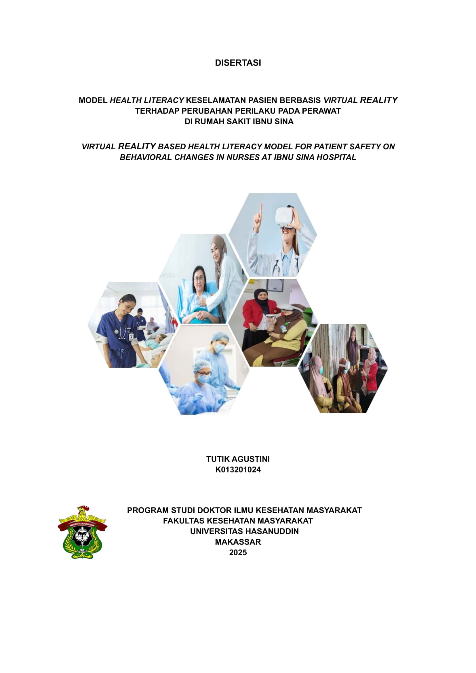 TUTIK AGUSTINI. Model Health Literacy Keselamatan Pasien Berbasis Virtual Reality Terhadap Perubahan Perilaku Pada Perawat Di Rumah Sakit Ibnu Sina (dibimbing oleh Ridwan Amiruddin, M. Furqaan, Naiem dan Fridawaty Rivai) Latar Belakang:.Keselamatan pasien adalah prinsip dasar dalam perawatan kesehatan yang bertujuan untuk mengurangi risiko dan kesalahan yang dapat dihindari Meskipun berbagai upaya dilakukan, tantangan besar tetap ada, terutama di negara berpenghasilan rendah dan menengah, termasuk Indonesia, di mana pelaporan insiden keselamatan pasien masih rendah. Salah satu solusi inovatif yang menjanjikan adalah penggunaan teknologi realitas virtual (VR) untuk melatih perawat dalam meningkatkan keterampilan keselamatan pasien secara efektif dan aman. Tujuan: Membuat Model Health Literacy Keselamatan Pasien Berbasis Virtual Reality Terhadap Perubahan Perilaku Perawat Di Rumah Sakit Ibnu sina Metode: Penelitian ini merupakan studi mixed-method yang terdiri dari tiga tahap: Eksplorasi kualitatif menggunakan pendekatan interpretive descriptive, pengembangan dan validasi model virtual reality, serta uji quasi eksperimen pada 2 kelompok (intervensi dan kontrol). Sebanyak 15 partisipan dilibatkan dalam FGD dan wawancara mendalam pada tahap kualitatif, sedangkan uji efektifitas dilakukan terhadap perawat rawat inap dengan total responden 68 0rang. Pengumpulan data dilakukan melalui observasi , kuesioner, uji expert. Tahap ketiga penelitian kuantitatif dengan kelompok kontrol sebanyak 34 orang dan kelompok intervensi sebanyak 34 orang dari responde sebanyak 68 orang. Pada Hasil: tahap I menunjukkan bahwa meskipun berbagai system keselamatan pasien telah diterapkan di rumah sakit, masih terdapat kendala signifikan, seperti kekurangan perawat dan minimnya pelatihan, yang menandakan perlunya metode pembelajaran yang lebih efektif dan menarik seperti penggunaan teknologi virtual reality untuk meningkatkan literasi keselamatan pasie.. Tahap II bahwa pengembangan model literasi keselamatan pasien berbasis virtual reality terbukti efektif dalam meningkatkan pemahaman sikap, dan ketrampilan perawat melalui simulasi kejadian nyata, serta evaluasi setelah latihan, yang memperkuat budaya keselamatan pasien di rumah sakit. Tahap III ada pengaruh pengetahuan, sikap dan tindakan sebelum dan sesudah diberikan model health literacy tentang keselamatan pasien menggunakan virtual relity (<0,001). Kesimpulan: Penelitian ini berhasil membuat model health literacy keselamatan pasien berbasis virtual reality terhadap perubahan perilaku perawat di rumah sakit Ibnu Sina.