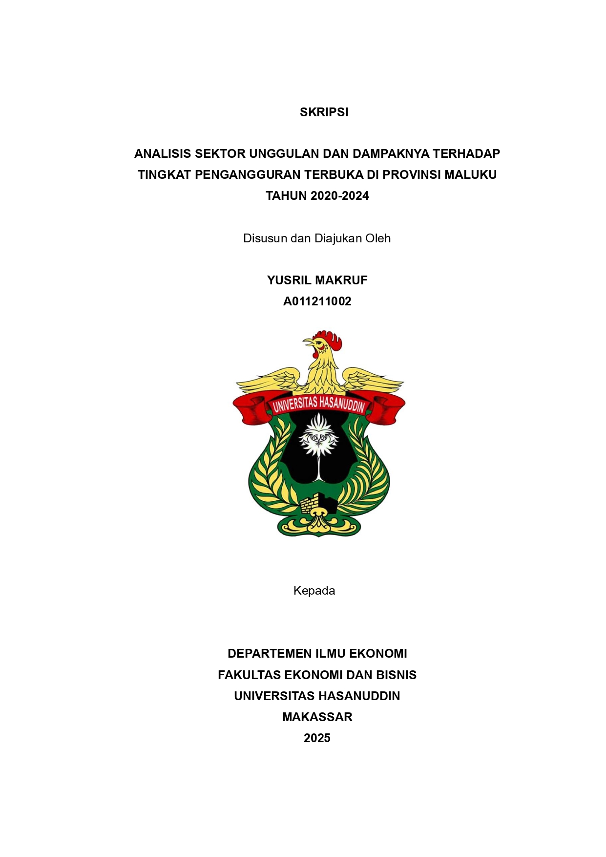 MAKRUF, YUSRIL (2025) ANALISIS SEKTOR UNGGULAN DAN DAMPAKNYA TERHADAP TINGKAT PENGANGGURAN TERBUKA DI PROVINSI MALUKU TAHUN 2020-2024 = AN ANALYSIS OF LEADING SECTORS AND THEIR IMPACT ON THE OPEN UNEMPLOYMENT RATE IN MALUKU PROVINCE (2020–2024). Skripsi thesis, Universitas Hasanuddin.