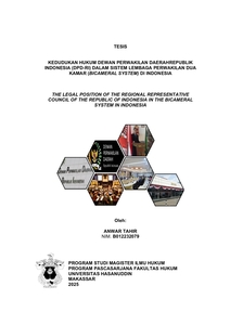 ANWAR TAHIR (B012232079). Kedudukan Hukum Dewan Perwakilan Daerah Republik Indonesia (DPD-RI) dalam Sistem Lembaga Perwakilan Dua Kamar (Bicameral System) di Indonesia. Dibimbing oleh Aminuddin Ilmar. Latar Belakang: Kewenangan DPD yang terbatas dianggap melemahkan checks and balances dengan DPR, sehingga diperlukan reformulasi hukum. Tujuan: Untuk menjelaskan kedudukan hukum dan pengaturan hukum DPD-RI dalam sistem kelembagaan dua kamar. Metode: Penelitian hukum normatif melalui pendekatan perundang-undangan dan konseptual. Bahan hukum primer meliputi Undang-Undang Dasar Negara Republik Indonesia Tahun 1945, naskah historikal pembentukan DPD-RI, Undang- Undang Nomor 13 Tahun 2019 tentang perubahan ketiga atas Undang- Undang Nomor 17 Tahun 2014 Tentang MPR, DPR, DPD dan DPRD, serta Peraturan DPD-RI Nomor 1 Tahun 2022 tentang Tata Tertib. Bahan hukum sekunder seperti naskah akademis, rancangan undang-undang dan lainnya. Analisis yang digunakan adalah analisis kualitatif deskriptif. Hasil: (1) Kedudukan hukum DPD seharusnya sama dan setara dengan DPR. DPD harus memiliki hak legislasi untuk mengajukan, membahas, dan mengesahkan undang-undang, serta hak anggaran untuk membahas dan menyetujui APBN serta mengawasi pelaksanaannya. Selain itu, DPD perlu hak pengawasan untuk memastikan kebijakan pemerintah dilaksanakan dengan transparan dan akuntabel. (2) DPD Seharusnya diatur dalam kedudukan yang sama dengan DPR dan tidak hanya sekadar sebagai lembaga yang mengusulkan, melainkan DPD-RI harus memiliki kedudukan yang sama dengan DPR, dengan hak dan kewajiban setara. Kesimpulan: Kedudukan hukum dan pengaturan hukum Dewan Perwakilan Daerah (DPD) dengan Dewan Perwakilan Rakyat (DPR) seharusnya adalah sama, bahkan memiliki hak dan kewajiban yang sama. Oleh karena itu, amandemen kelima diperlukan untuk mempertegas kewenangan legislasi DPD demi mencapai checks and balances system yang ideal.