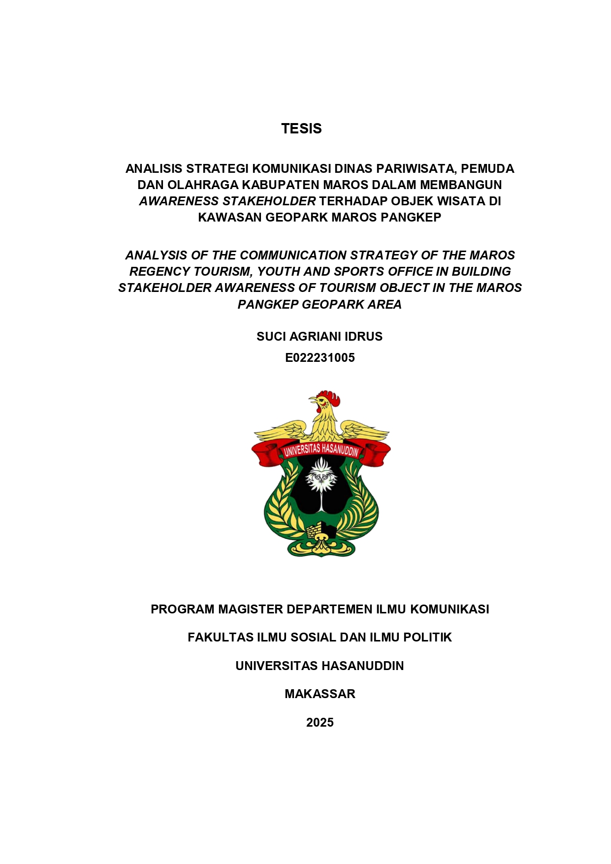 SUCI AGRIANI IDRUS. Analisis Strategi Komunikasi Dinas Pariwisata, Pemuda dan Olahraga Kabupaten Maros Dalam Membangun Awareness Stakeholder Eksternal Terhadap Objek Wisata Di Kawasan Geopark Maros Pangkep” (dibimbing oleh Muh Akbar dan Kahar). Penelitian ini bertujuan (1) untuk menganalisis strategi komunikasi yang diterapkan oleh Dinas Pariwisata, Pemuda, dan Olahraga Kabupaten Maros dalam membangun awareness stakeholder eksternal terhadap objek wisata Geopark Maros Pangkep, (2) Untuk mendeskripsikan upaya yang dihadapi oleh Dinas Pariwisata,Pemuda, dan Olahraga Kabupaten Maros untuk menyelesaikan tantangan dan hambatan dalam membangun awareness Stakeholder Eksternal terhadap objek Wisata di Kawasan Geopark Maros-Pangkep. penelitian ini menggunakan pendekatan kualitatif deskriptif, dengan teknik pengumpulan data berupa wawancara mendalam dan observasi partisipatif. Analisis data dilakukan dengan menggunakan model interaktif Miles dan Huberman, yang meliputi reduksi data, penyajian data, dan penarikan kesimpulan. Hasil penelitian menunjukkan bahwa strategi komunikasi yang digunakan meliputi pemanfaatan media digital (terutama media sosial), penyuluhan dan edukasi kepada masyarakat lokal, kerja sama dengan stakeholder lintas sektor seperti lembaga pendidikan, komunitas, dan media, serta penguatan brand pariwisata Geopark Maros-Pangkep melalui narasi visual dan kultural. Strategi ini bersifat partisipatif dan menekankan pada kolaborasi antar unsur pentahelix. Sementara itu, upaya penyelesaian tantangan difokuskan pada peningkatan literasi digital masyarakat, penguatan koordinasi antarlembaga, inovasi konten promosi, dan pengembangan kapasitas SDM. Hambatan yang dihadapi meliputi keterbatasan anggaran, minimnya pemahaman geowisata oleh masyarakat, serta belum optimalnya peran media dalam mendukung promosi kawasan geopark.