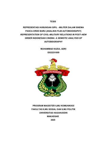 ADRI, MUHAMMAD NUZUL (2025) REPRESENTASI HUBUNGAN SIPIL - MILITER DALAM SINEMA PASCA ORDE BARU (ANALISIS FILM AUTOBIOGRAPHY) = REPRESENTATION OF CIVIL–MILITARY RELATIONS IN POST–NEW ORDER INDONESIAN CINEMA: A SEMIOTIC ANALYSIS OF AUTOBIOGRAPHY. Thesis thesis, Universitas Hasanuddin.