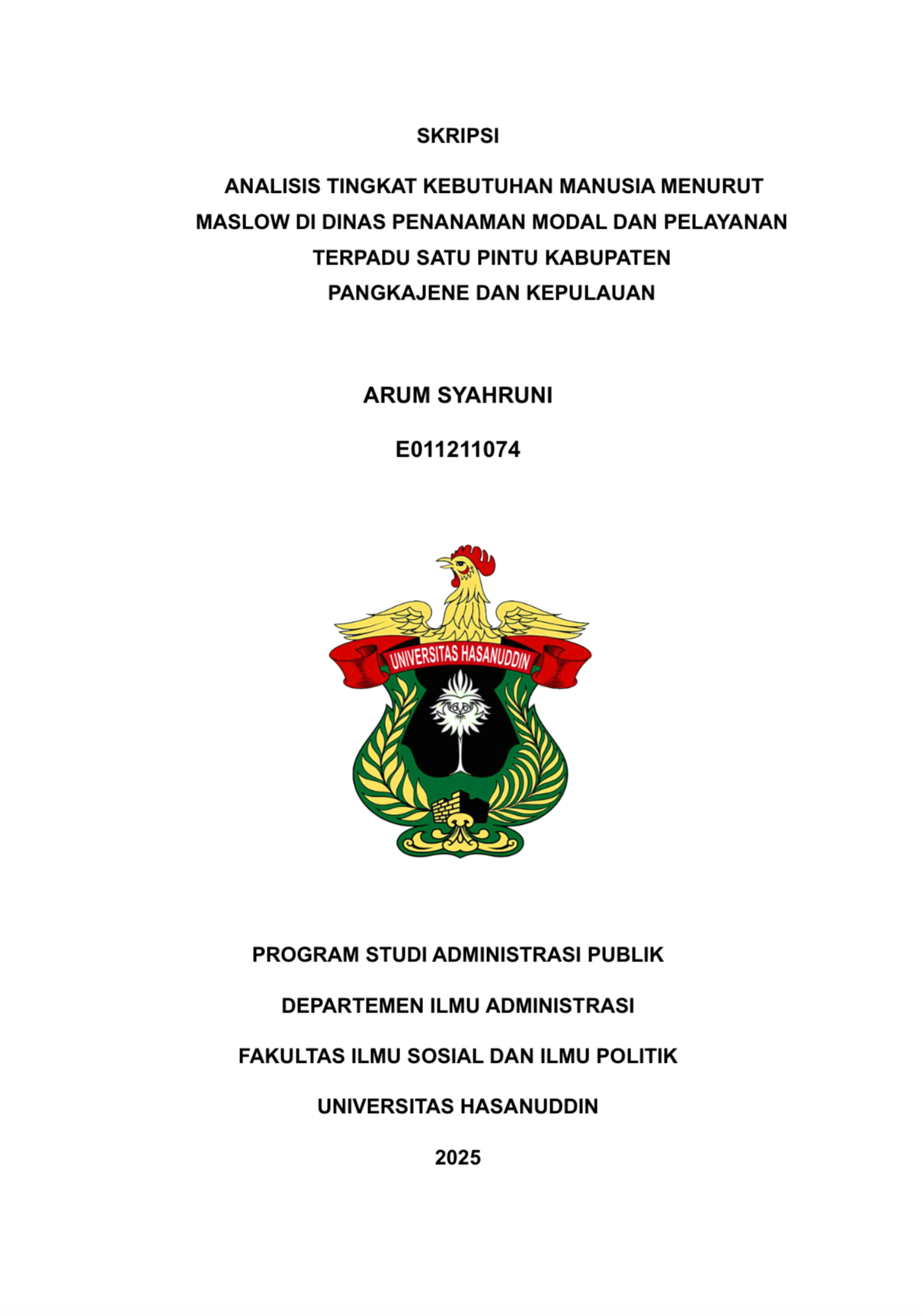 SYAHRUNI, ARUM (2025) ANALISIS TINGKAT KEBUTUHAN MANUSIA MENURUT MASLOW DI DINAS PENANAMAN MODAL DAN PELAYANAN TERPADU SATU PINTU KABUPATEN PANGKAJENE DAN KEPULAUAN = ANALYSIS OF THE LEVEL OF HUMAN NEEDS ACCORDING TO MASLOW OF THE DEPARTMENT OF CAPITAL INVESTMENT AND INTEGRATED SERVICES ONE DOOR OF PANGKAJENE REGENCY AND ISLANDS. Skripsi thesis, UNIVERSITAS HASANUDDIN.