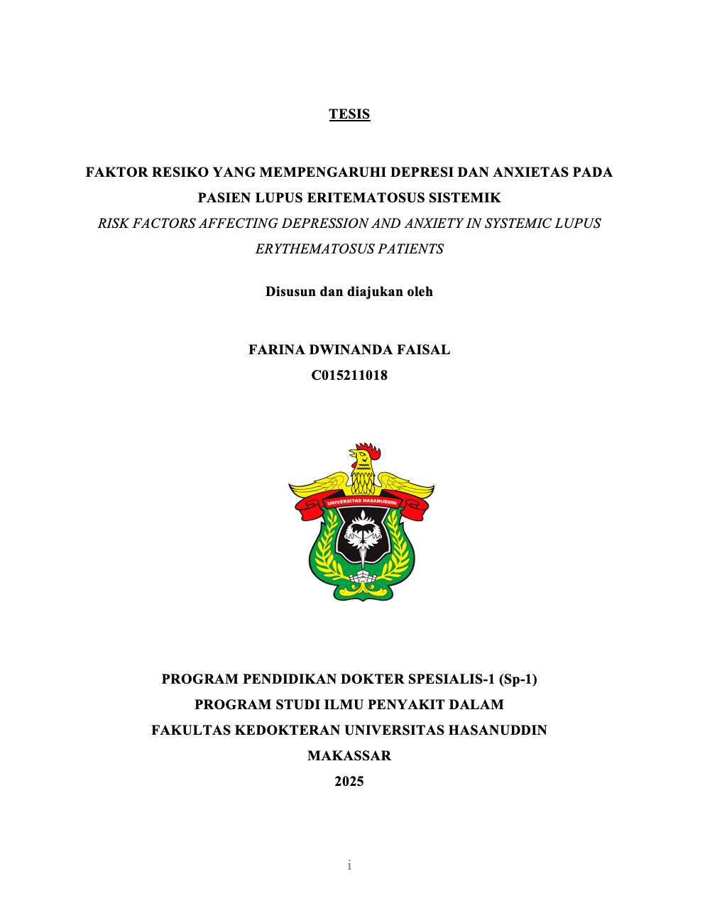 FAISAL, FARINA DWINANDA (2025) FAKTOR RESIKO YANG MEMPENGARUHI DEPRESI DAN ANXIETAS PADA PASIEN LUPUS ERITEMATOSUS SISTEMIK = RISK FACTORS AFFECTING DEPRESSION AND ANXIETY IN SYSTEMIC LUPUS ERYTHEMATOSUS PATIENTS. Thesis thesis, Universitas Hasanuddin.