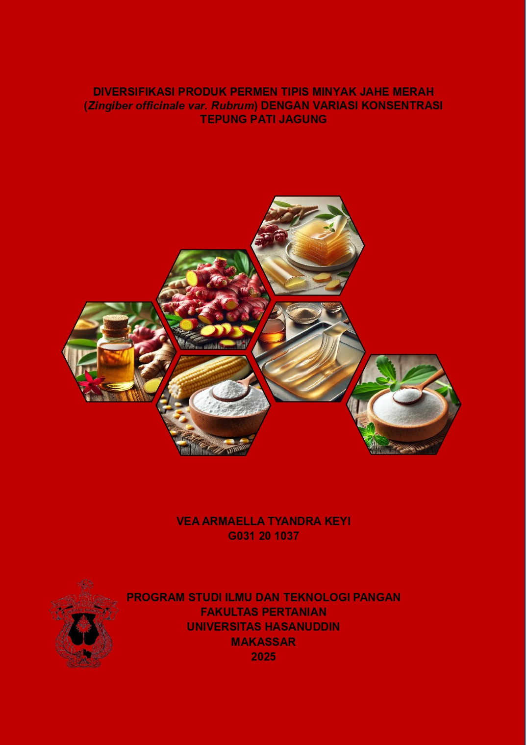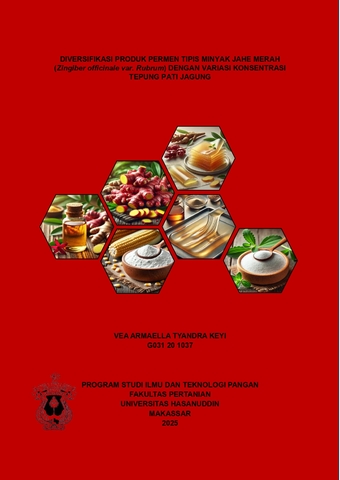 KEYI, VEA ARMAELLA TYANDRA (2025) DIVERSIFIKASI PRODUK PERMEN TIPIS MINYAK JAHE MERAH (Zingiber officinale var. Rubrum) DENGAN VARIASI KONSENTRASI TEPUNG PATI JAGUNG = DIVERSIFICATION OF RED GINGER (ZINGIBER OFFICINALE VAR. RUBRUM) OIL THIN CANDY PRODUCTS WITH VARIED CONCENTRATIONS OF MAIZE FLOUR. Skripsi thesis, Universitas Hasanuddin.