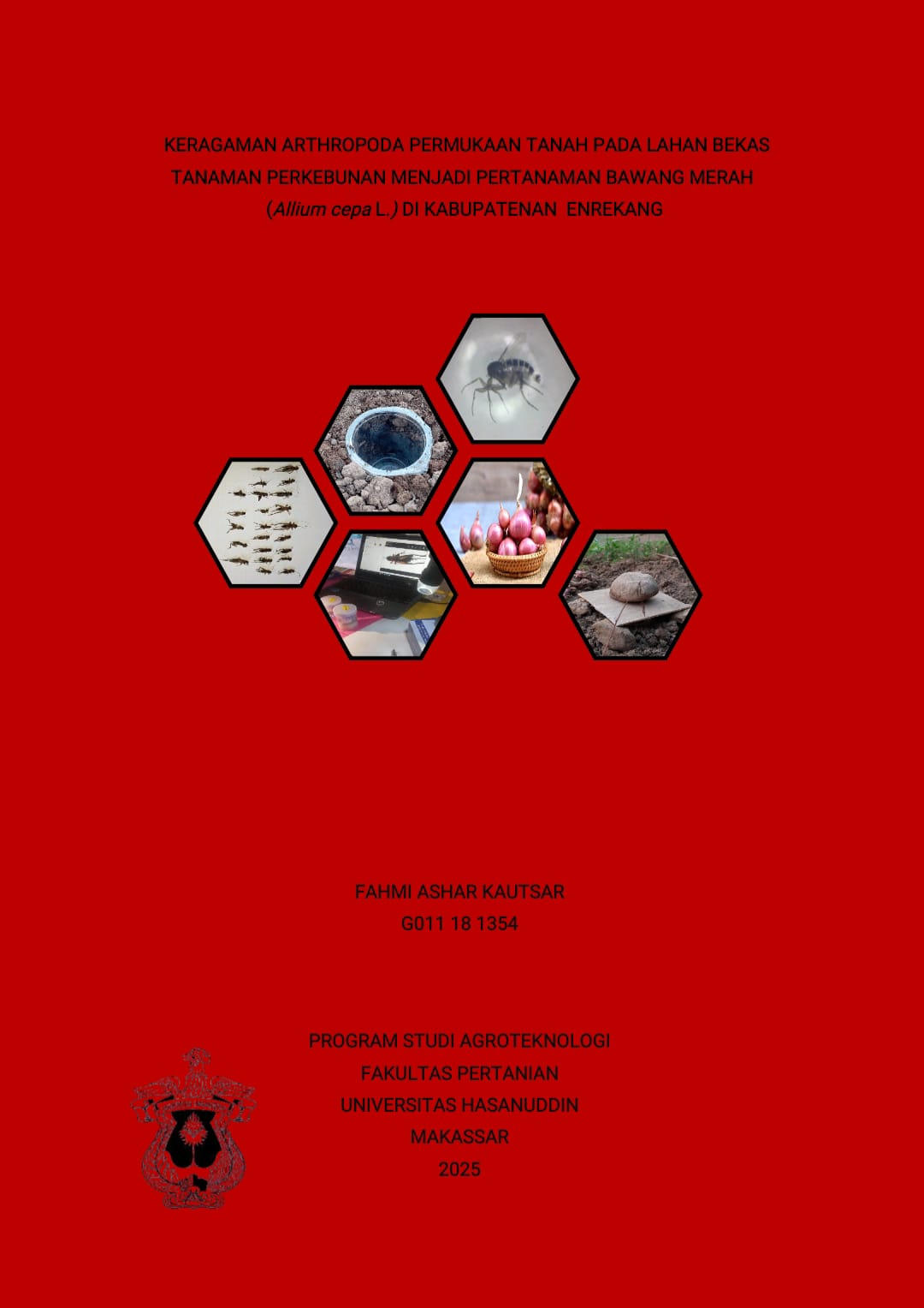 ABSTRAK FAHMI ASHAR KAUTSAR. Keragaman arthropoda permukaan tanah pada lahan bekas tanaman perkebunan menjadi pertanaman bawang merah di kabupaten Enrekang. (Dibimbing oleh Sulaeha Sulaeha dan Fatahuddin). Produksi dan permintaan bawang merah terus meningkat setiap tahunnya, sehingga terjadi alih fungsi lahan dari perkebunan menjadi lahan pertanian hortikultura, khususnya bawang merah. Perubahan ini berpengaruh terhadap ekosistem, termasuk keanekaragaman arthropoda permukaan tanah yang memiliki peran penting dalam keseimbangan ekosistem pertanian. Penelitian ini bertujuan untuk mengidentifikasi dan menganalisis keragaman arthropoda permukaan tanah pada lahan bekas pertanaman bawang merah di Kabupaten Enrekang. Penelitian dilakukan menggunakan metode pitfall trap yang ditempatkan dilokasi penelitian dengan interval tertentu untuk menangkap arthropoda permukaan tanah. Hasil penelitian menunjukkan bahwa terdapat tiga kelas arthropoda dengan 23 jenis yang terdiri atas 9 ordo dan 17 famili. Analisis peranan ekologis menunjukkan bahwa arthropoda yang ditemukan terdiri dari dekomposer (2.946 individu), hama (48 individu), predator (34 individu), dan parasitoid (47 individu). Indeks keanekaragaman Shannon-Wiener menunjukkan nilai keanekaragaman sedang (1,086 - 2,168), dengan dekomposer sebagai kelompok dominan. Hasil penelitian ini mengindikasikan bahwa alih fungsi lahan mempengaruhi komposisi dan peran arthropoda di ekosistem pertanian. Data ini dapat menjadi dasar dalam pengelolaan organisme pengganggu tanaman (OPT) secara terpadu untuk menjaga keseimbangan ekosistem pertanian bawang merah. Kata kunci: Arthropoda permukaan tanah, keanekaragaman, pitfall trap, bawang merah, PHT