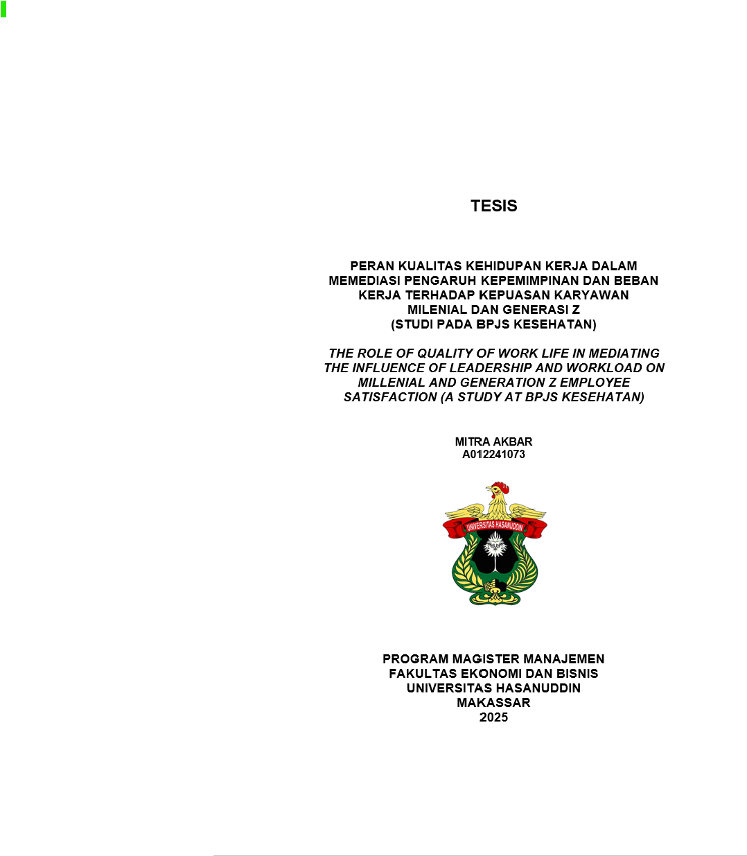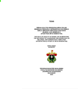 AKBAR, MITRA (2025) PERAN KUALITAS KEHIDUPAN KERJA DALAM MEMEDIASI PENGARUH KEPEMIMPINAN DAN BEBAN KERJA TERHADAP KEPUASAN KARYAWAN MILENIAL DAN GENERASI Z (STUDI PADA BPJS KESEHATAN) = THE ROLE OF QUALITY OF WORK LIFE IN MEDIATING THE INFLUENCE OF LEADERSHIP AND WORKLOAD ON MILLENIAL AND GENERATION Z EMPLOYEE SATISFACTION (A STUDY AT BPJS KESEHATAN). Thesis thesis, Universitas Hasanuddin.
