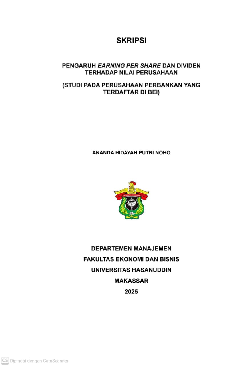 NOHO, ANANDA HIDAYAH PUTRI (2025) PENGARUH EARNING PER SHARE DAN DIVIDEN TERHADAP NILAI PERUSAHAAN (STUDI PADA PERUSAHAAN PERBANKAN YANG TERDAFTAR DI BEI) = The Effect of Earnings per Share and Dividends on Firm Value (A Study on Banking Companies Listed on the Indonesia Stock Exchange). Skripsi thesis, Universitas Hasanuddin.