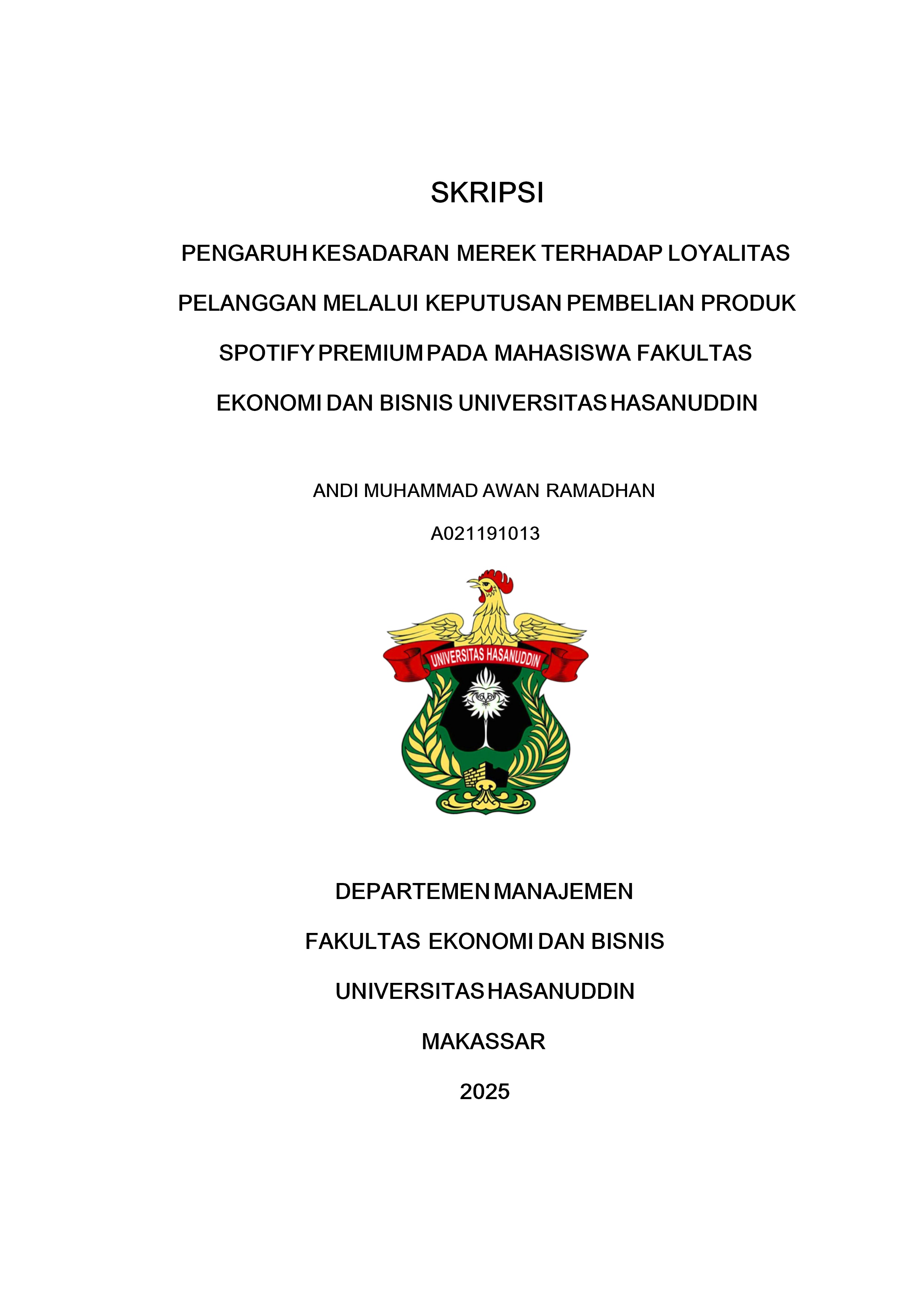Ramadhan, Andi Muhammad Awan (2025) PENGARUH KESADARAN MEREK TERHADAP LOYALISAT PELANGGAN MELALUI KEPUTUSAN PEMBELIAN PRODUK SPOTIFY PREMIUM PADA MAHASISWA FAKULTAS EKONOMI DAN BISNIS UNIVERSITAS HASANUDDIN = THE EFFECT OF BRAND AWARENESS ON CUSTOMER LOYALTY THROUGH THE PURCHASE DECISION OF SPOTIFY PREMIUM PRODUCTS AMONG STUDENTS OF THE FACULTY OF ECONOMICS AND BUSINESS, HASANUDDIN UNIVERSITY. Skripsi thesis, Universitas Hasanuddin.