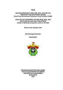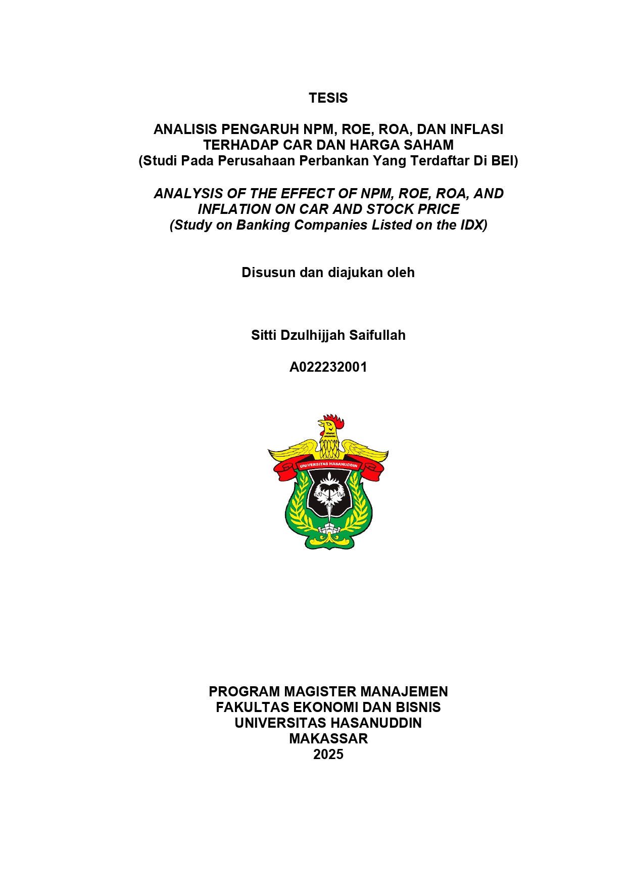 SAIFULLAH, SITTI DZULHIJJAH (2025) ANALISIS PENGARUH NPM, ROE, ROA, DAN INFLASI TERHADAP CAR DAN HARGA SAHAM (Studi Pada Perusahaan Perbankan Yang Terdaftar Di BEI) = ANALYSIS OF THE EFFECT OF NPM, ROE, ROA, AND INFLATION ON CAR AND STOCK PRICE (Study on Banking Companies Listed on the IDX). Thesis thesis, Universitas Hasanuddin.