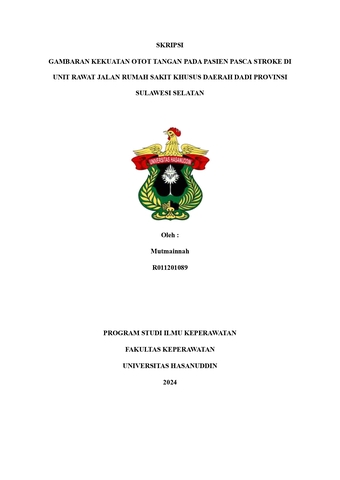 MUTMAINNAH, MUTMAINNAH (2024) GAMBARAN KEKUATAN OTOT TANGAN PADA PASIEN PASCA STROKE DI UNIT RAWAT JALAN RUMAH SAKIT KHUSUS DAERAH DADI PROVINSI SULAWESI SELATAN = DESCRIPTION OF HAND MUSCLE STRENGTH IN POST-STROKE PATIENTS IN THE OUTPATIENT UNIT OF DADI REGIONAL SPECIAL HOSPITAL, SOUTH SULAWESI PROVINCE. Skripsi thesis, Universitas Hasanuddin.