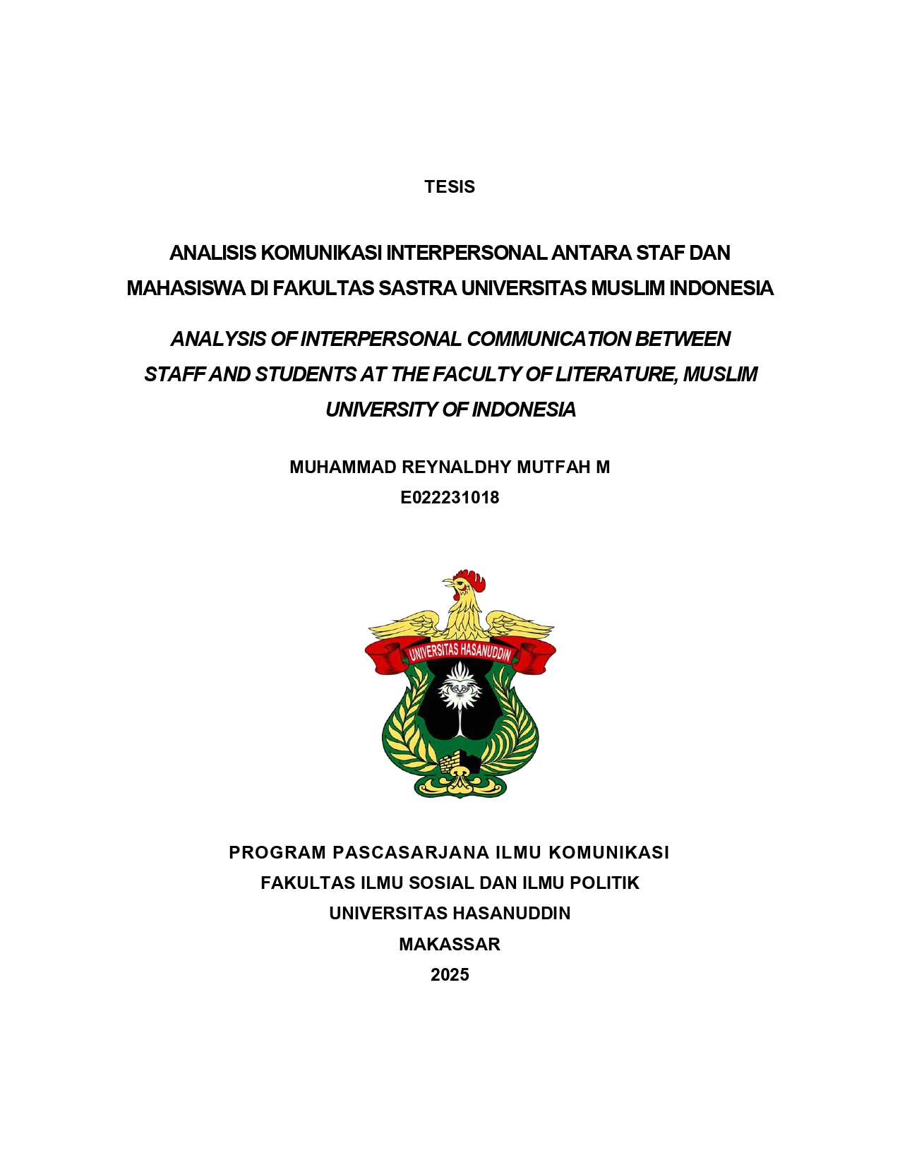 MUHAMMAD REYNALDHY MUTFAH. Analisis Komunikasi Interpersonal antara Staf dan Mahasiswa di Fakultas Sastra Universitas Muslim Indonesia. (Dibimbing oleh Muh. Akbar dan Kahar). Penelitian ini bertujuan menganalisis komunikasi interpersonal antara staf dan mahasiswa di Fakultas Sastra Universitas Muslim Indonesia. Fokus utama penelitian mencakup dua aspek, yakni bentuk komunikasi interpersonal yang terjadi antara staf dan mahasiswa dan faktor-faktor yang mendukung dan menghambat komunikasi tersebut. Penelitian ini menggunakan pendekatan kualitatif dengan metode wawancara mendalam dan observasi partisipatif untuk memperoleh data yang holistik dan kontekstual. Hasil penelitian menunjukkan bahwa komunikasi interpersonal antara staf dan mahasiswa berlangsung dalam bentuk verbal dan nonverbal, baik melalui interaksi tatap muka maupun media digital seperti WhatsApp. Komunikasi tatap muka dinilai lebih efektif dalam membangun kedekatan emosional dan kepercayaan. Staf akademik berupaya menciptakan suasana komunikasi yang terbuka, ramah, dan suportif, sedangkan mahasiswa merasa terbantu secara emosional dan akademik melalui interaksi ini. Faktorfaktor yang mendukung komunikasi interpersonal meliputi keterbukaan, empati, sikap positif, dan dukungan emosional. Sebaliknya, hambatan komunikasi muncul dari keterbatasan waktu, perbedaan persepsi, dan kurang optimalnya pemanfaatan teknologi komunikasi oleh sebagian pihak.