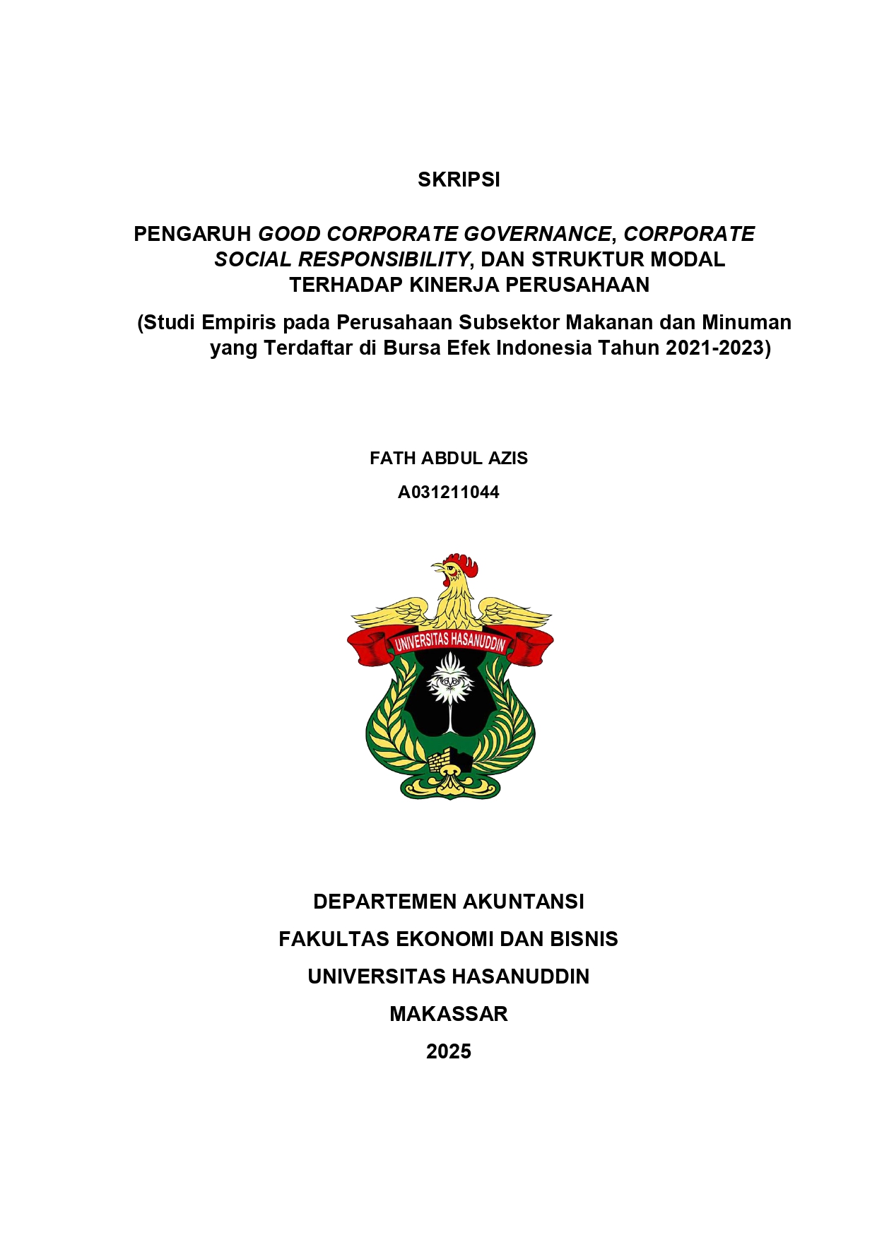 AZIS, FATH ABDUL (2025) Pengaruh Good Corporate Governance, Corporate Social Responsibility, dan Struktur Modal terhadap Kinerja Perusahaan (Studi Empiris Pada Perusahaan Subsektor Makanan dan Minuman yang Terdaftar di Bursa Efek Indonesia Tahun 2021-2023) = The Effect of Good Corporate Governance, Corporate Social Responsibility, and Capital Structure on Firm Performance (Empirical Study on Food and Beverage Subsector Companies Listed on the Indonesia Stock Exchange for the Period 2021–2023). Skripsi thesis, Universitas Hasanuddin.