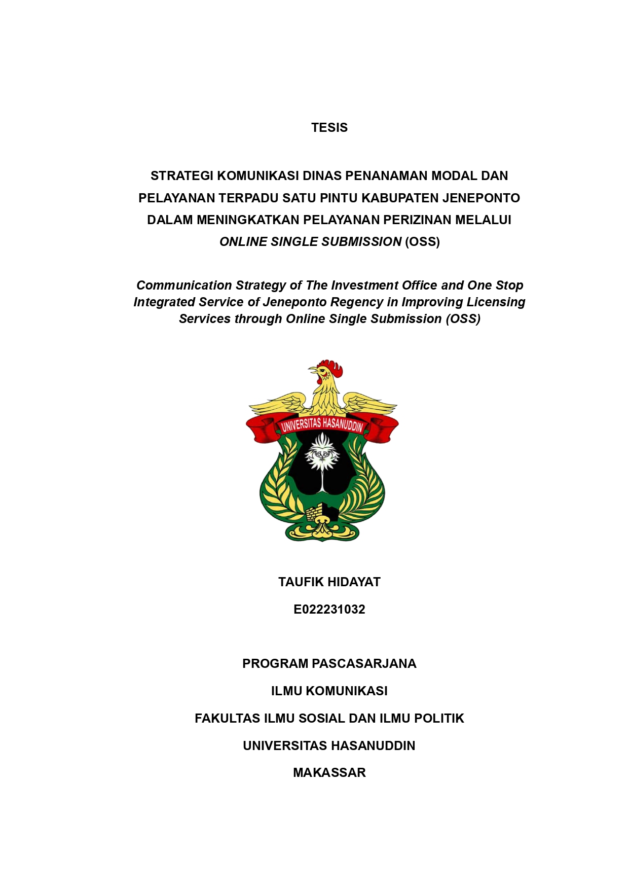 HIDAYAT, TAUFIK (2025) STRATEGI KOMUNIKASI DINAS PENANAMAN MODAL DAN PELAYANAN TERPADU SATU PINTU KABUPATEN JENEPONTO DALAM MENINGKATKAN PELAYANAN PERIZINAN MELALUI ONLINE SINGLE SUBMISSION (OSS) = Communication Strategy of The Investment Office and One Stop Integrated Service of Jeneponto Regency in Improving Licensing Services through Online Single Submission (OSS). Thesis thesis, UNIVERSITAS HASSANUDDIN.