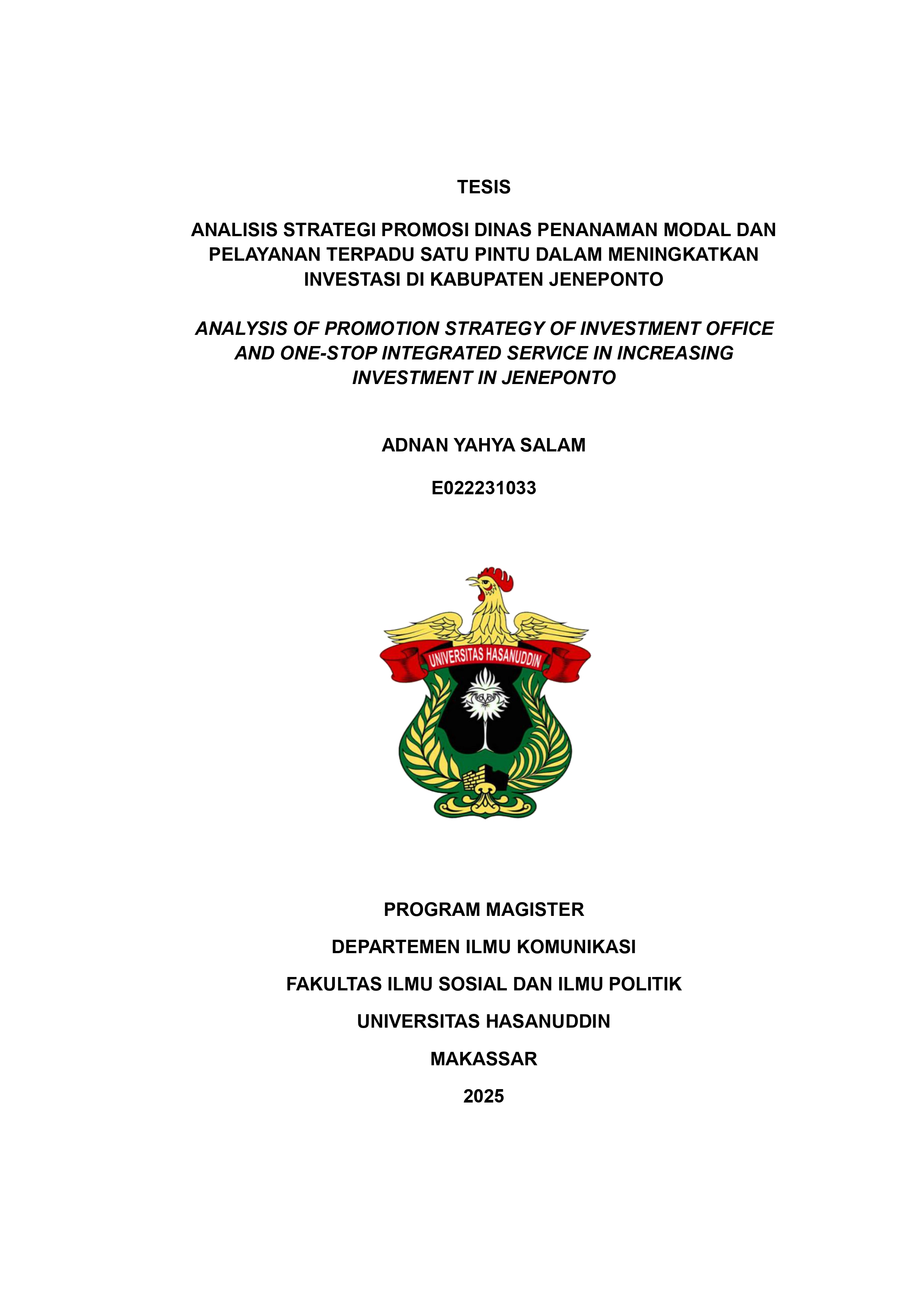SALAM, ADNAN YAHYA (2025) Analisis Strategi Promosi Dinas Penanaman Modal dan Pelayanan Terpadu Satu Pintu dalam Meningkatkan Investasi di Kabupaten Jeneponto = Analysis of Promotion Strategy of Investment Office and One-Stop Integrated Service in Increasing Investment in Jeneponto. Thesis thesis, UNIVERSITAS HASSANUDDIN.