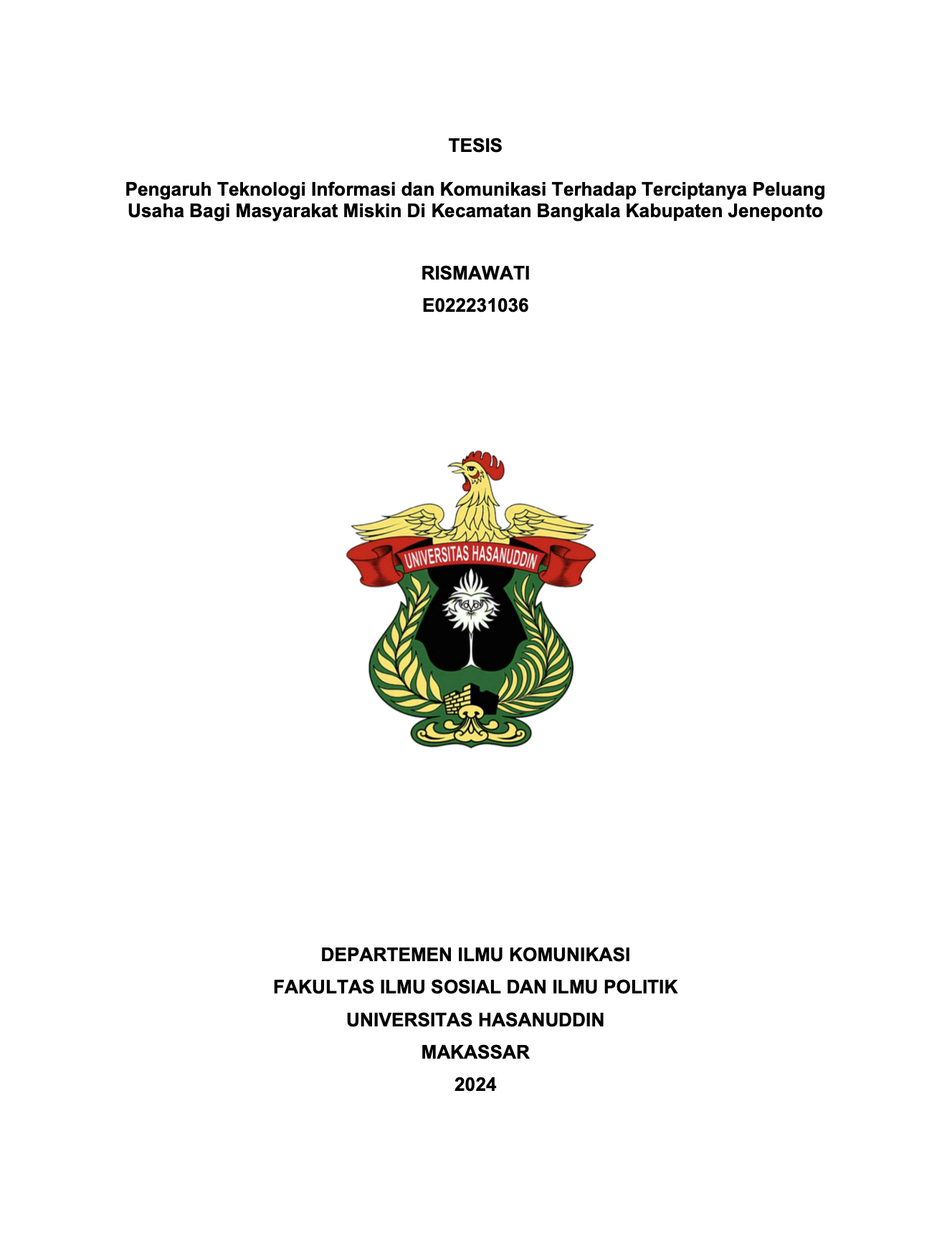 RISMAWATI, RISMAWATI (2025) Pengaruh Teknologi Informasi dan Komunikasi Terhadap Terciptanya Peluang Usaha Bagi Masyarakat Miskin Di Kecamatan Bangkala Kabupaten Jeneponto = The Effect of Information and Communication Technology on the Creation of Business Opportunities for the Poor Community in Bangkala District, Jeneponto Regency. Thesis thesis, UNIVERSITAS HASSANUDDIN.