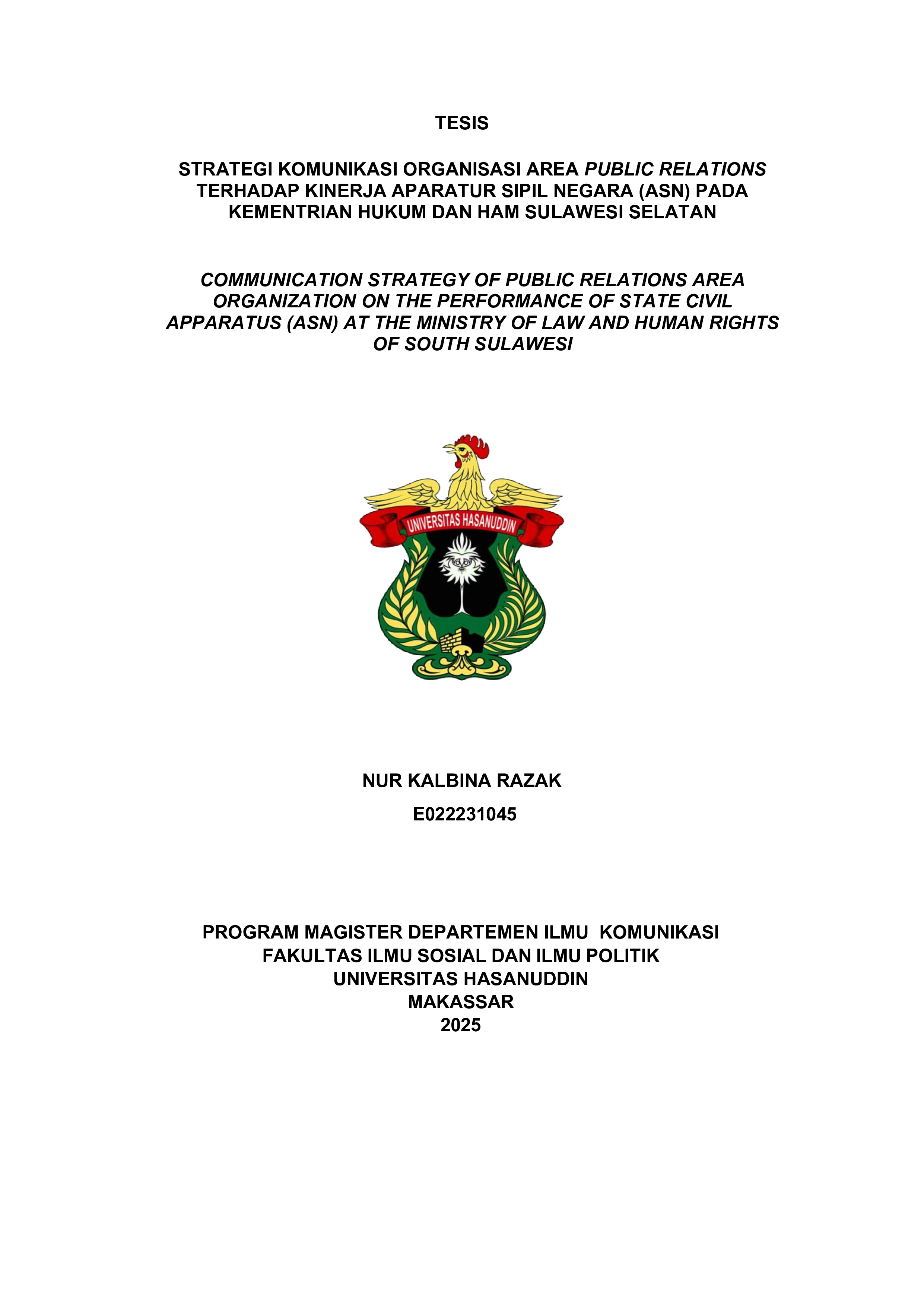 RAZAK, NUR KALBINA (2025) STRATEGI KOMUNIKASI ORGANISASI AREA PUBLIC RELATIONS TERHADAP KINERJA APARATUR SIPIL NEGARA (ASN) PADA KEMENTRIAN HUKUM DAN HAM SULAWESI SELATAN = COMMUNICATION STRATEGY OF PUBLIC RELATIONS AREA ORGANIZATION ON THE PERFORMANCE OF STATE CIVIL APPARATUS (ASN) AT THE MINISTRY OF LAW AND HUMAN RIGHTS OF SOUTH SULAWESI. Thesis thesis, UNIVERSITAS HASSANUDDIN.