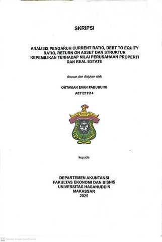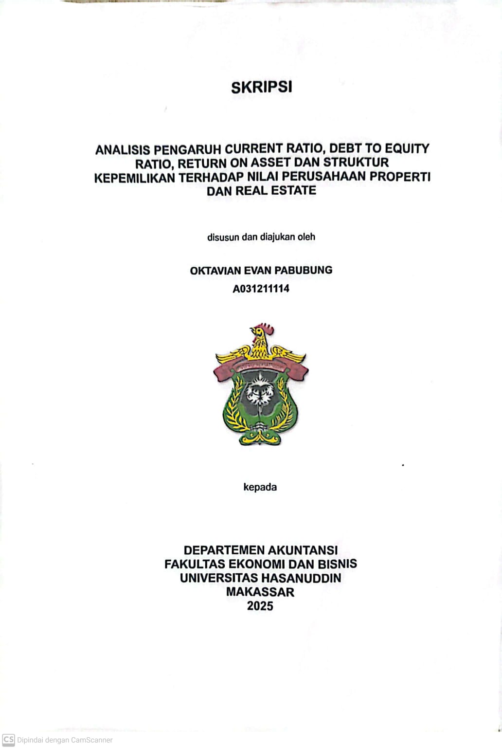 PABUBUNG, OKTAVIAN EVAN (2025) ANALISIS PENGARUH CURRENT RATIO, DEBT TO EQUITY RATIO, RETURN ON ASSET DAN STRUKTUR KEPEMILIKAN TERHADAP NILAI PERUSAHAAN PROPERTI DAN REAL ESTATE = ANALYSIS OF THE EFFECT OF CURRENT RATIO, DEBT TO EQUITY RATIO, RETURN ON ASSET AND OWNERSHIP STRUCTURE ON THE VALUE OF PROPERTY AND REAL ESTATE COMPANIES. Skripsi thesis, Universitas Hasanuddin.