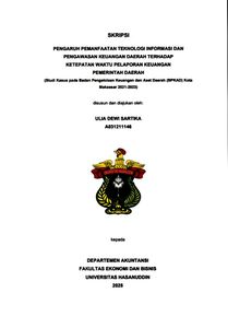 SARTIKA, ULIA DEWI (2025) PENGARUH PEMANFAATAN TEKNOLOGI INFORMASI DAN PENGAWASAN KEUANGAN DAERAH TERHADAP KETEPATAN WAKTU PELAPORAN KEUANGAN PEMERINTAH DAERAH (Studi Kasus pada Badan Pengelolaan Keuangan dan Aset Daerah (BPKAD) Kota Makassar 2021-2023) = THE INFLUENCE OF INFORMATION TECHNOLOGY USE AND REGIONAL FINANCIAL SUPERVISION ON THE TIMELINESS OF LOCAL GOVERNMENT FINANCIAL REPORTING (Case Study of the Makassar City Regional Financial and Asset Management Agency). Skripsi thesis, Universitas Hasanuddin.