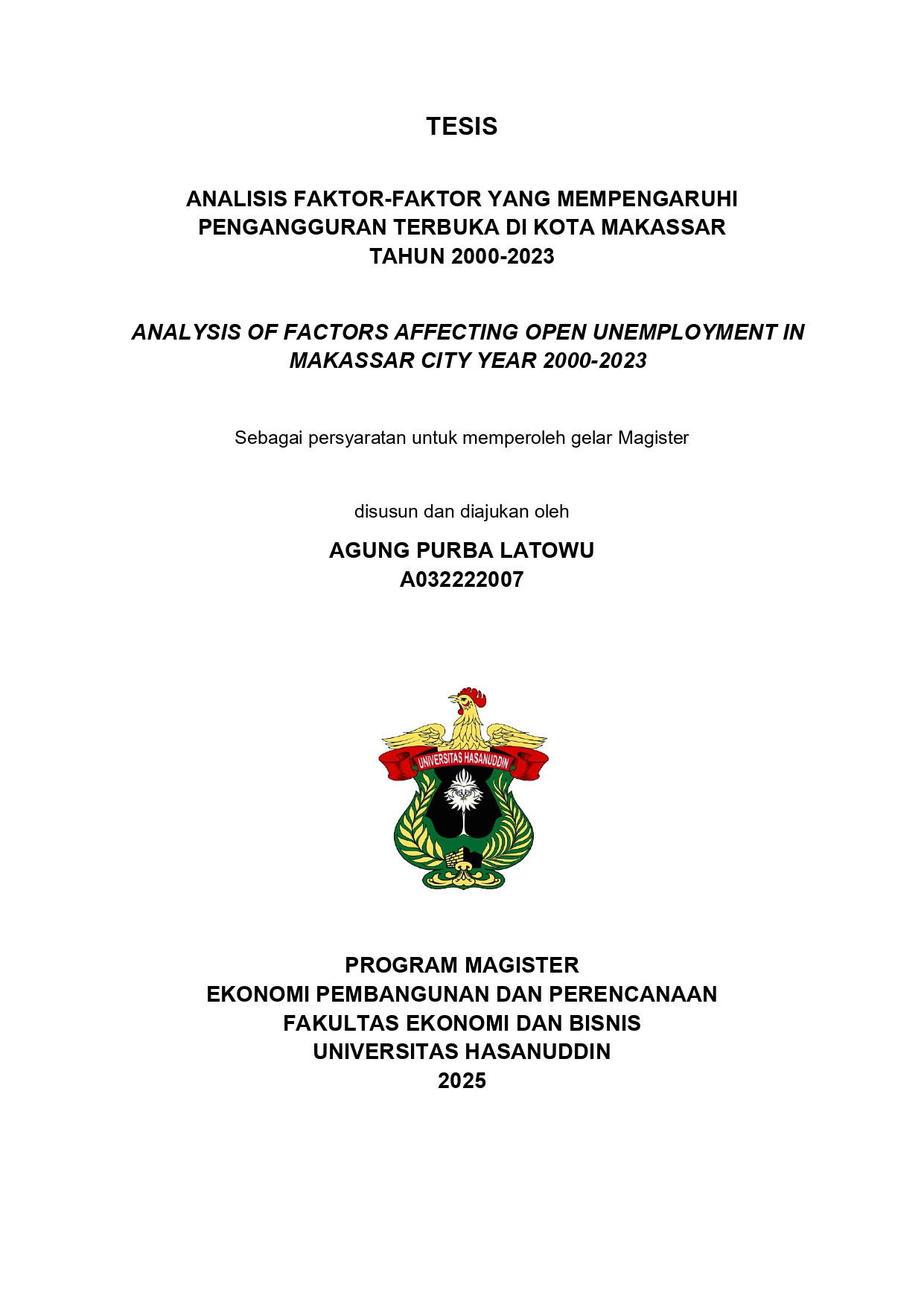 LATOWU, AGUNG PURBA (2025) ANALISIS FAKTOR-FAKTOR YANG MEMPENGARUHI PENGANGGURAN TERBUKA DI KOTA MAKASSAR TAHUN 2000-2023 = ANALYSIS OF FACTORS AFFECTING OPEN UNEMPLOYMENT IN MAKASSAR CITY YEAR 2000-2023. Thesis thesis, Universitas Hasanuddin.
