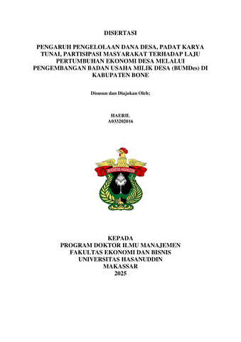 HAERIL, HAERIL (2025) PENGARUH PENGELOLAAN DANA DESA, PADAT KARYA TUNAI, PARTISIPASI MASYARAKAT TERHADAP LAJU PERTUMBUHAN EKONOMI DESA MELALUI PENGEMBANGAN BADAN USAHA MILIK DESA (BUMDes) DI KABUPATEN BONE = THE INFLUENCE OF VILLAGE FUND MANAGEMENT, CASH FOR WORK, AND COMMUNITY PARTICIPATION ON THE RATE OF VILLAGE ECONOMIC GROWTH THROUGH THE DEVELOPMENT OF VILLAGE-OWNED ENTERPRISES (BADAN USAHA MILIK DESA (BUMDES) IN BONE REGENCY. Disertasi thesis, Universitas Hasanuddin.
