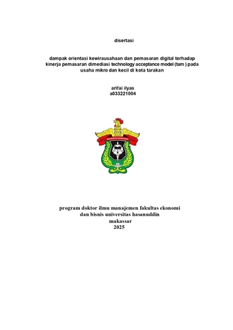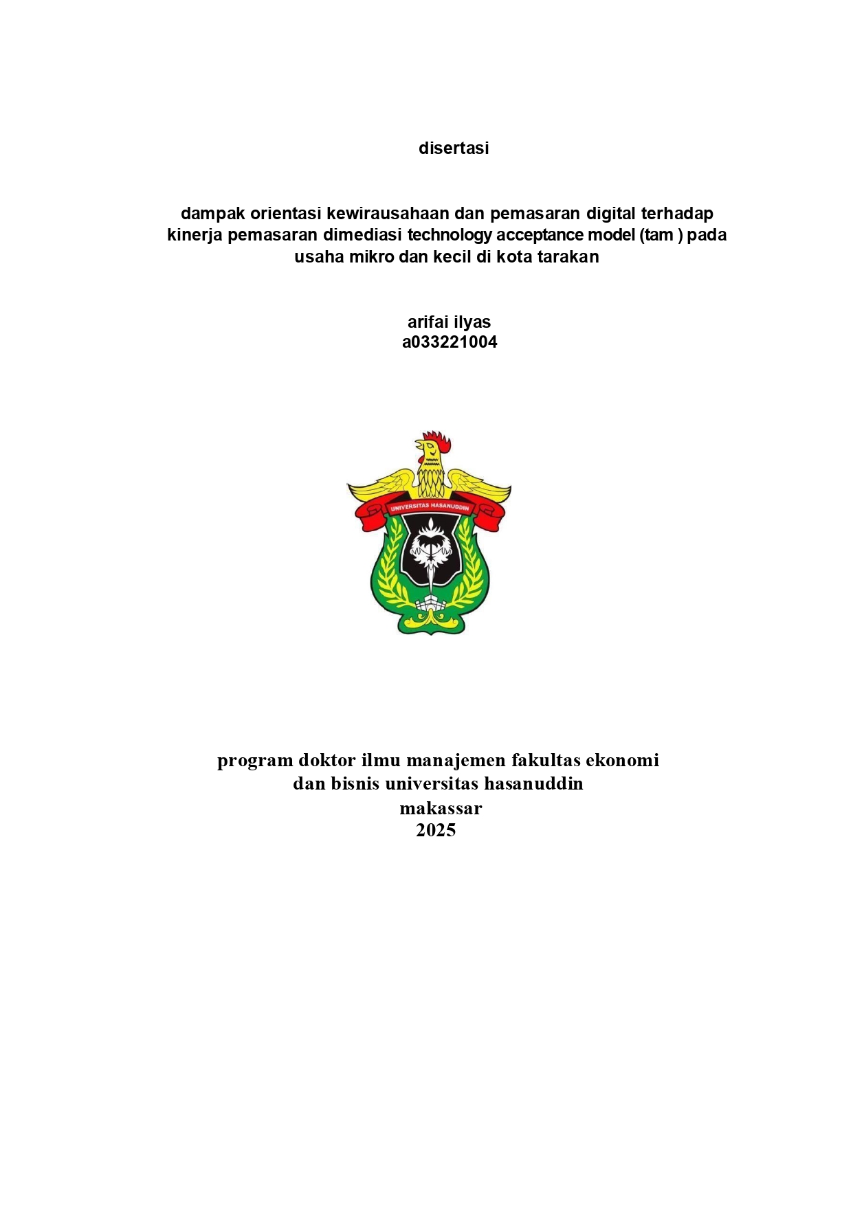 ILYAS, ARIFAI (2025) DAMPAK ORIENTASI KEWIRAUSAHAAN DAN PEMASARAN DIGITAL TERHADAP KINERJA PEMASARAN DIMEDIASI TECHNOLOGY ACCEPTANCE MODEL (TAM ) PADA USAHA MIKRO DAN KECIL DI KOTA TARAKAN = The Impact of Entrepreneurial Orientation and Digital Marketing on Marketing Performance Mediated by the Technology Acceptance Model (TAM) in Micro and Small Enterprises in Tarakan City. Disertasi thesis, Universitas Hasanuddin.