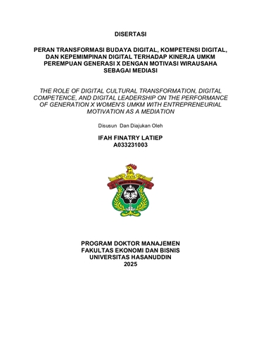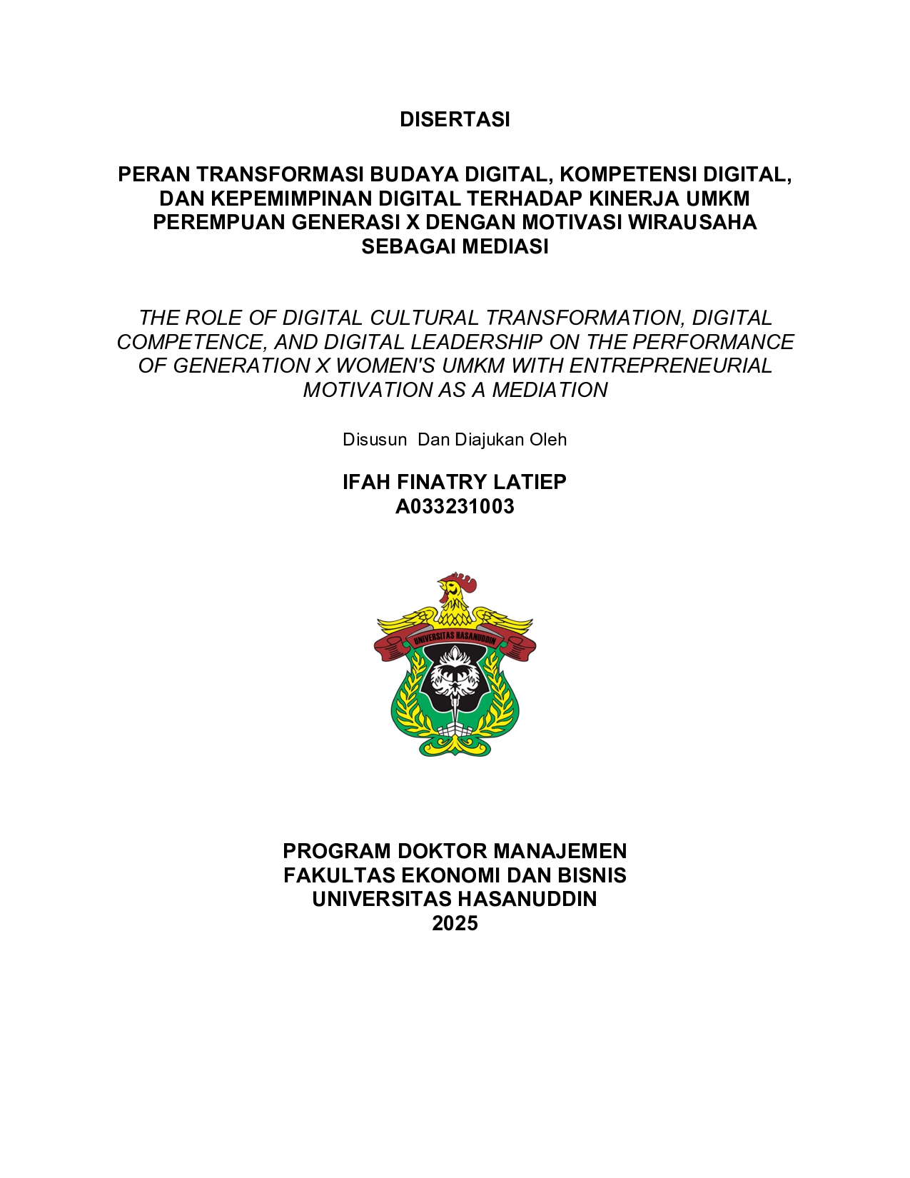 LATIEP, IFAH FINATRY (2025) DAMPAK TRANSFORMASI BUDAYA DIGITAL, KOMPETENSI DIGITAL, DAN KEPEMIMPINAN DIGITAL TERHADAP KINERJA UMKM PEREMPUAN GENERASI X DENGAN MOTIVASI WIRAUSAHA SEBAGAI MEDIASI = THE ROLE OF DIGITAL CULTURAL TRANSFORMATION, DIGITAL COMPETENCE, AND DIGITAL LEADERSHIP ON THE PERFORMANCE OF GENERATION X WOMEN'S UMKM WITH ENTREPRENEURIAL MOTIVATION AS A MEDIATION. Disertasi thesis, Universitas Hasanuddin.