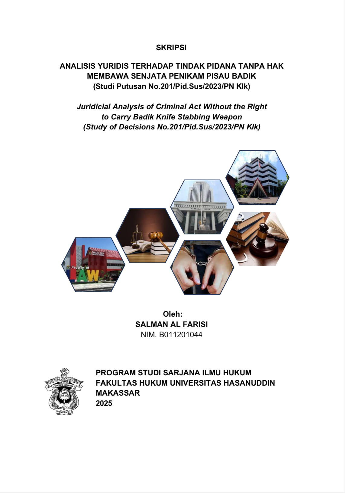 FARISI, SALMAN AL (2025) ANALISIS YURIDIS TERHADAP TINDAK PIDANA TANPA HAK MEMBAWA SENJATA PENIKAM PISAU BADIK (Studi Putusan No.201/Pid.Sus/2023/PN Klk) = Juridicial Analysis of Criminal Act Without the Right to Carry Badik Knife Stabbing Weapon (Study of Decisions No.201/Pid.Sus/2023/PN Klk). Skripsi thesis, UNIVERSITAS HASANUDDIN MAKASSAR.