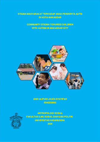 Andi Alifiah Jauza Syatifah Stigma Masyarakat Terhadap Penderita Anak Autis di Kota Makassar. (Dimbingan oleh Prof. Dr. Ansar Arifin, MS.). Latar Belakang. Melihat anak tumbuh dan berkembang dengan normal adalah hal yang diinginkan oleh orang tua. Beberapa anak mengalami gangguan dalam masa pertumbuhannya, salah satunya adalah Autism Spectrum Disorder (ASD). Autisme adalah salah satu gangguan pada masa kanak-kanak yang menakutkan bagi orang tua saat ini. Tujuan. Penelitian ini bertujuan untuk menganalisis jenis dan tingkat stigma yang dialami anak penderita autis dalam lingkungan sosialnya mengidentifikasi faktor-faktor yang mempengaruhi terbentuknya dan berlanjutnya stigma terhadap anak penderita autis, dan mengembangkan strategi untuk mengurangi stigma dan meningkatkan penerimaan sosial terhadap anak penderita autisme. Metode. Penelitian ini yang digunakan yaitu kualitatif deskriptif analitik. Hasil. Hasil penelitian ini menunjukkan bahwa bentuk stigma terhadap anak penderita autis di Kota Makassar berkaitan dengan lingkungan sosial, keluarga, pendidikan, dan kebijakan. Kemudian, faktor munculnya stigma terhadap anak penderita autis berkaitan dengan faktor sosial dan budaya, kurangnya pemahaman, interaksi sosial, pendidikan dan layanan, serta pengalaman pribadi. Sedangkan upaya yang dapat dilakukan oleh lembaga pendidikan untuk mengurangi stigma terhadap anak penderita autis dimana layanan pendidikan ini berkaitan dengan peran keluarga dan lembaga pendidikan. Kesimpulan. Dalam bentuk stigma terhadap anak autis dapat menjelaskan mengenai lingkungan sosial adalah semua orang di sekitar seseorang yang dapat mempengaruhi mereka. Pendidikan adalah proses pembelajaran yang berlangsung sepanjang hidup yang bertujuan untuk meningkatkan pengetahuan, keterampilan, sikap, dan nilai seseorang. Kebijakan yang berkaitan dengan pemerintah terhadap stigma anak autis mencakup seperangkat langkah, aturan, dan program yang dirancang untuk mengurangi stigma dan diskriminasi yang dihadapi oleh anak-anak dengan autisme.