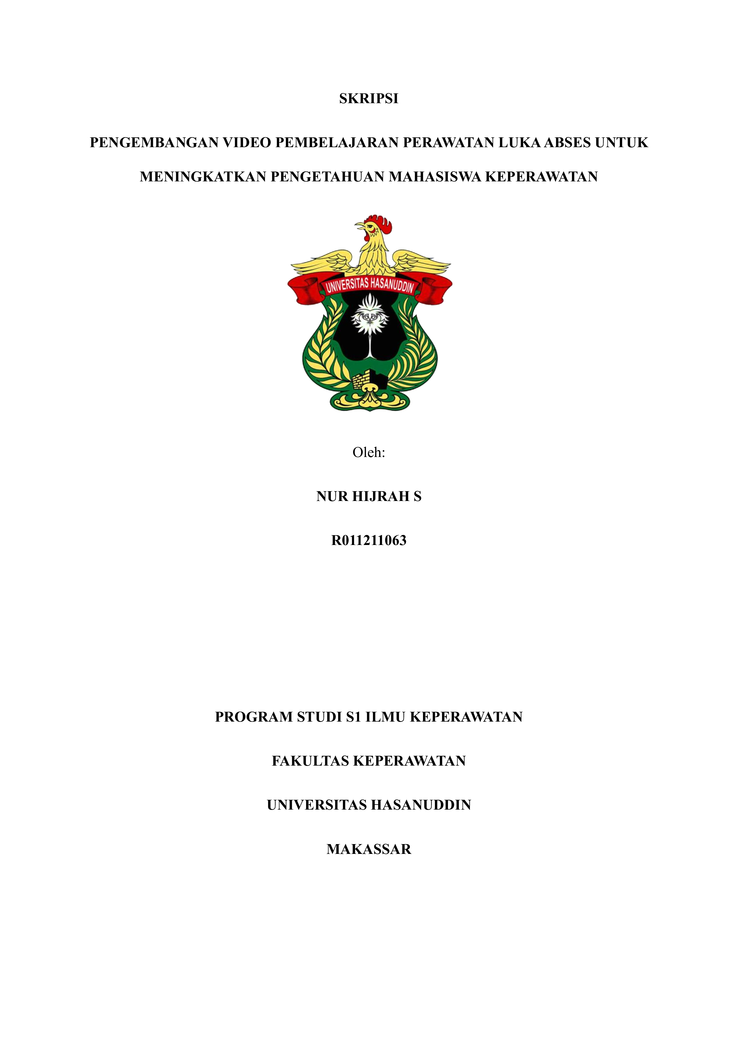 HIJRAH S., NUR (2025) Pengembangan Video Pembelajaran Perawatan Luka Abses untuk Meningkatkan Pengetahuan Mahasiswa Keperawatan = Development Of Abscess Wound Care Learning Video To Improve Nursing Students Knowledge. Skripsi thesis, Universitas Hasanuddin.