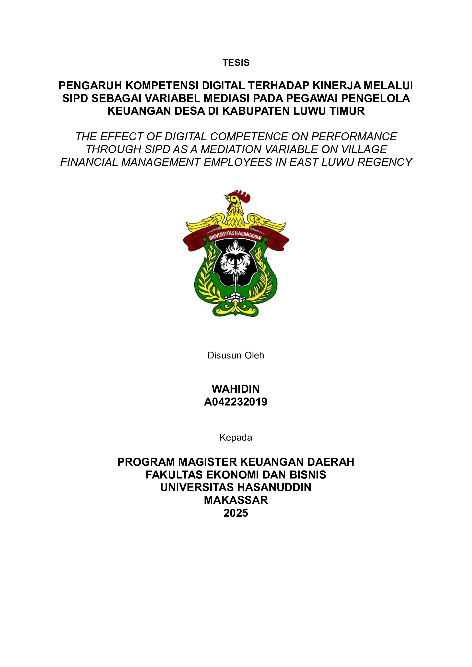 Wahidin. Pengaruh Kompetensi Digital Terhadap Kinerja Melalui Sipd Sebagai Variabel Mediasi Pada Pegawai Pengelola Keuangan Desa Di Kabupaten Luwu Timur. (Dibimbing oleh Maat Pono). Latar belakang. Perkembangan teknologi digital di Indonesia telah mengubah cara kerja aparatur pemerintah, termasuk aparatur desa. Tujuan penelitian yakni menganalisis pengaruh kompetensi digital terhadap kinerja pegawai pengelola keuangan desa di Kabupaten Luwu Timur baik secara langsung dan tidak langsung jika dimediasi penggunaan SIPD. Metode penelitian ini menggunakan pendekatan kuantitatif. Pengumpulan data primer menggunakan suatu metode survei. Lokasi pelaksanaan penelitian ini yaitu di Kabupaten Luwu Timur Waktu pelaksanaan penelitian ini mulai bulan september sampai November 2025. Subjek penelitian yang diambil adalah pegawai sehinggah lebih refresentative dalam mewakili penelitian yang diangkat. Sampel dalam penelitian ini yaitu seluruh pegawai operator SIPD Tingkat desa dengan jumlah desa sebanyak 124 responden. Dalam penelitian digunakan teknik sampel jenuh. Hasil penelitian menunjukkan bahwa kompetensi digital pegawai operator desa di Luwu Timur terbukti berpengaruh positif dan signifikan terhadap penggunaan SIPD serta langsung meningkatkan kinerja pengelola keuangan desaditandai efektivitas, efisiensi, dan akuntabilitas yang lebih baik. Pemanfaatan SIPD sendiri juga berpengaruh positif dan signifikan terhadap kinerja melalui ketepatan waktu, akurasi data, dan transparansi laporan. Lebih jauh, penggunaan SIPD memediasi secara signifikan hubungan antara kompetensi digital dan kinerja, sehingga peningkatan kompetensi digital dan optimalisasi SIPD perlu dilakukan secara simultan untuk memperkuat tata kelola keuangan desa.