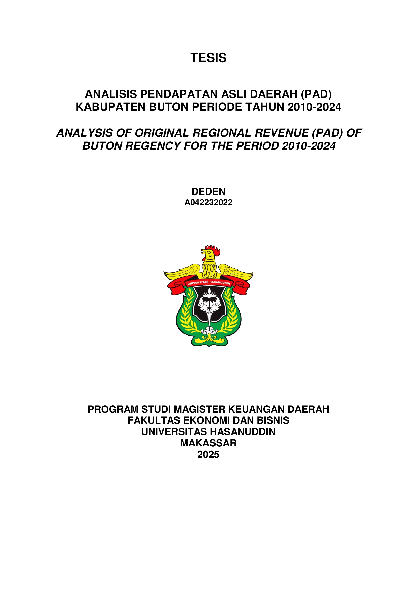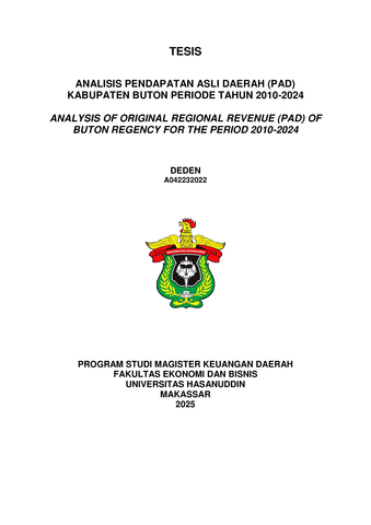 DEDEN, DEDEN (2025) ANALISIS PENDAPATAN ASLI DAERAH (PAD) KABUPATEN BUTON PERIODE TAHUN 2010-2024 = ANALYSIS OF ORIGINAL REGIONAL REVENUE (PAD) OF BUTON REGENCY FOR THE PERIOD 2010-2024. Thesis thesis, Universitas Hasanuddin.