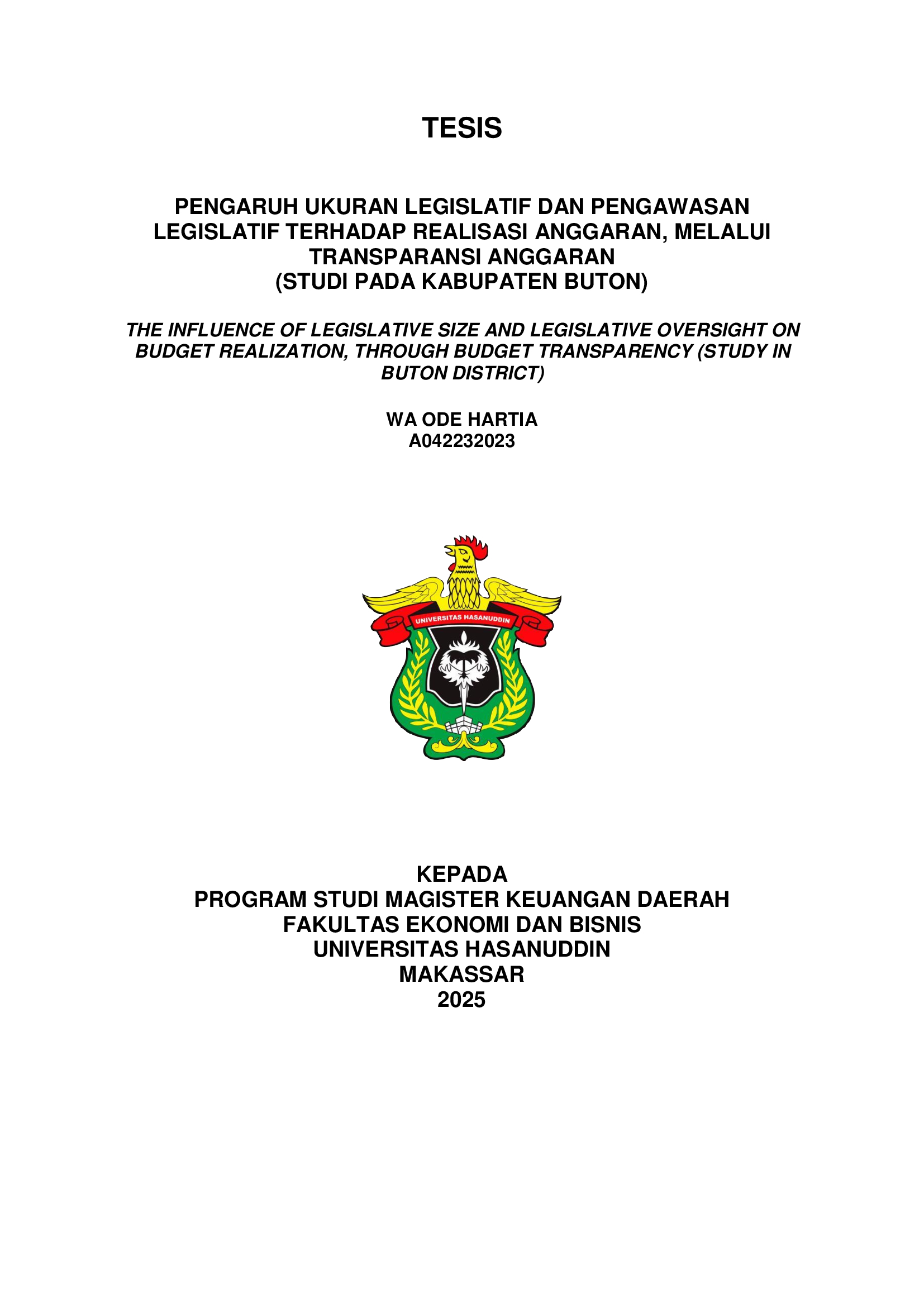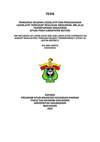 HARTIA, WA ODE (2025) PENGARUH UKURAN LEGISLATIF DAN PENGAWASAN LEGISLATIF TERHADAP REALISASI ANGGARAN, MELALUI TRANSPARANSI ANGGARAN (STUDI PADA KABUPATEN BUTON) = THE INFLUENCE OF LEGISLATIVE SIZE AND LEGISLATIVE OVERSIGHT ON BUDGET REALIZATION, THROUGH BUDGET TRANSPARENCY (STUDY IN BUTON DISTRICT). Thesis thesis, Universitas Hasanuddin.