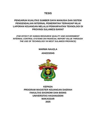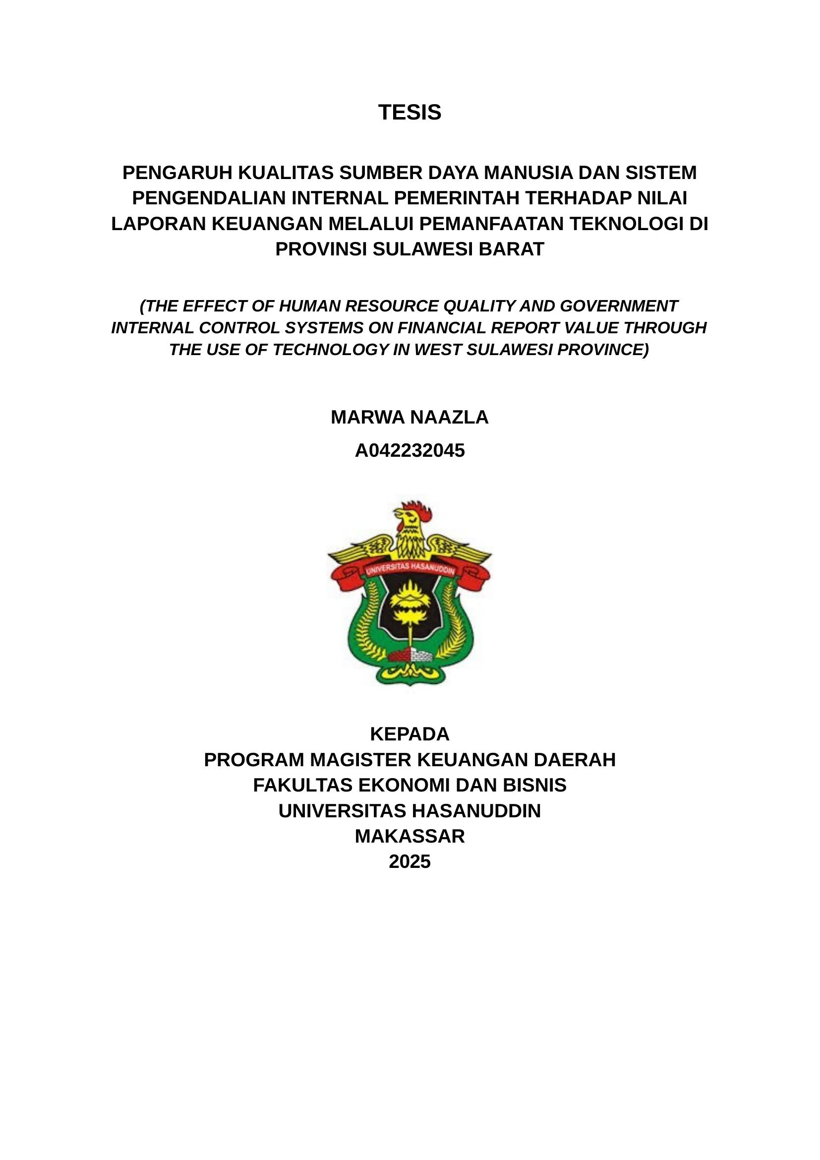 MARWA NAAZLA. Pengaruh Kualitas Sumber Daya Manusia dan Sistem Pengendalian Internal Pemerintah terhadap Nilai Laporan Keuangan melalui Pemanfaatan Teknologi di Provinsi Sulawesi Barat. (dibimbing oleh Dr. Hamrullah, Se., M.Si., CSF) Penelitian ini bertujuan untuk menganalisis pengaruh kualitas sumber daya manusia (SDM) dan sistem pengendalian internal pemerintah terhadap nilai laporan keuangan pemerintah daerah, serta peran pemanfaatan teknologi informasi sebagai variabel moderasi di Provinsi Sulawesi Barat. Pendekatan penelitian yang digunakan adalah kuantitatif dengan metode survei terhadap organisasi perangkat daerah (OPD). Data primer dikumpulkan melalui kuesioner, kemudian dianalisis menggunakan regresi linear berganda dan uji interaksi absolut. Hasil penelitian menunjukkan bahwa kualitas SDM dan sistem pengendalian internal pemerintah berpengaruh signifikan terhadap nilai laporan keuangan. Selain itu, pemanfaatan teknologi informasi terbukti memoderasi hubungan antara kualitas SDM dan sistem pengendalian internal dengan nilai laporan keuangan. Temuan ini menegaskan pentingnya peningkatan kapasitas SDM, penguatan sistem pengendalian internal, dan optimalisasi pemanfaatan teknologi informasi dalam mendukung transparansi dan akuntabilitas keuangan daerah. Implikasi praktis dari penelitian ini adalah perlunya kebijakan yang terfokus pada peningkatan kompetensi aparatur, perbaikan infrastruktur teknologi informasi, serta pengawasan berkelanjutan terhadap pengelolaan keuangan daerah.
