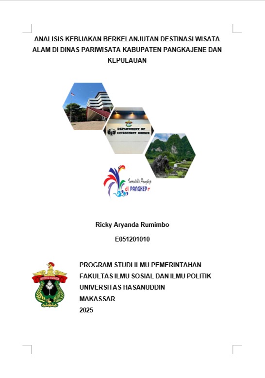 RUMIMBO, RICKY ARYANDA (2025) ANALISIS KEBIJAKAN BERKELANJUTAN DESTINASI WISATA ALAM DI DINAS PARIWISATA KABUPATEN PANGKAJENE DAN KEPULAUAN = Sustainable Policy Analysis of Natural Tourism Destinations at the Tourism Office of Pangkajene and Islands Regency. Skripsi thesis, Universitas Hasanuddin.