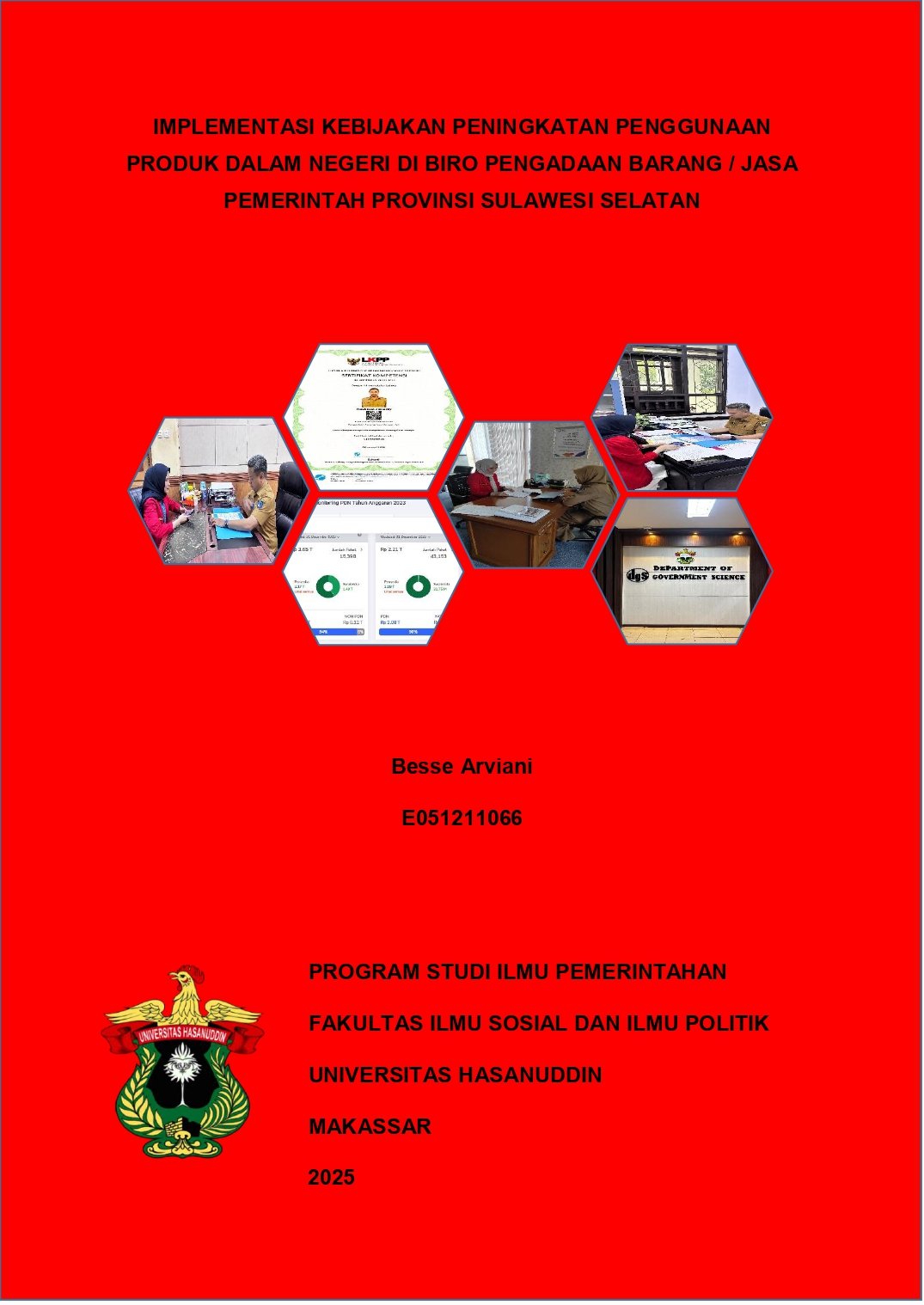 ARVIANI, BESSE (2025) IMPLEMENTASI KEBIJAKAN PENINGKATAN PENGGUNAAN PRODUK DALAM NEGERI DI BIRO PENGADAAN BARANG / JASA PEMERINTAH PROVINSI SULAWESI SELATAN = IMPLEMENTATION OF THE POLICY TO INCREASE THE USE OF DOMESTIC PRODUCTS IN THE PROCUREMENT OF GOODS/SERVICES BY THE PROVINCIAL GOVERNMENT OF SOUTH SULAWESI. Skripsi thesis, Universitas Hasanuddin.