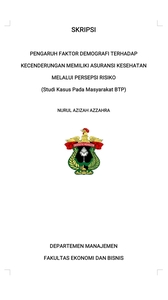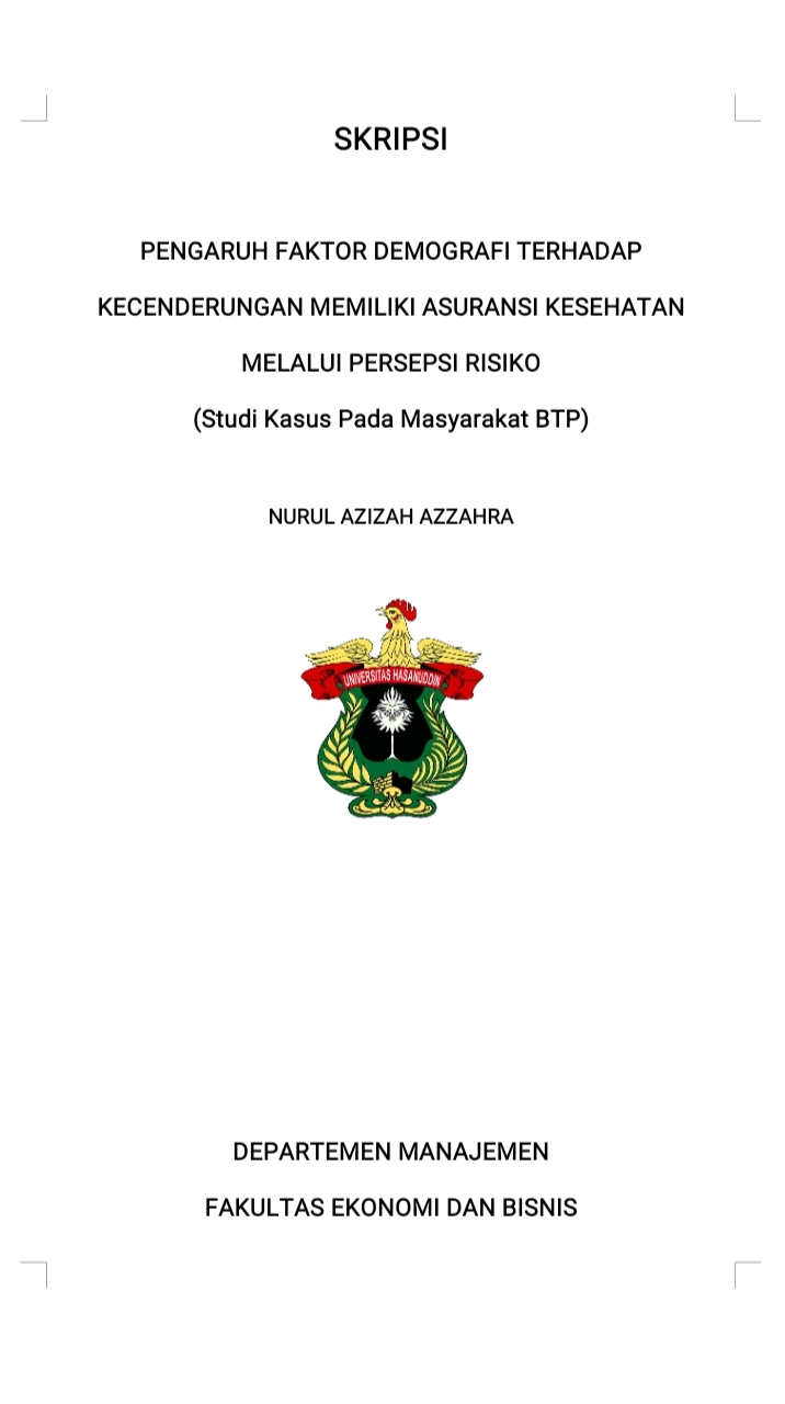 S., NURUL AZIZAH AZZAHRA (2025) PENGARUH FAKTOR DEMOGRAFI TERHADAP KECENDERUNGAN MEMILIKI ASURANSI KESEHATAN MELALUI PERSEPSI RISIKO (Studi Kasus Pada Masyarakat BTP) = THE INFLUENCE OF DEMOGRAPHIC FACTORS ON THE TENDENCY TO OWN HEALTH INSURANCE THROUGH RISK PERCEPTION (A Case Study on the BTP Community). Skripsi thesis, Universitas Hasanuddin.