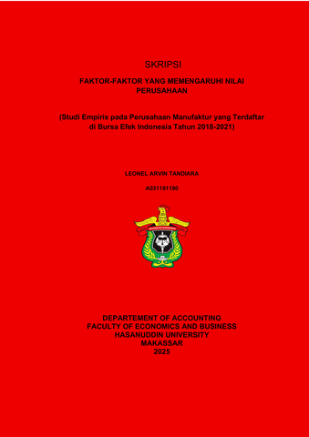 tandiara, leonel arvin (2025) FAKTOR-FAKTOR YANG MEMENGARUHI NILAI PERUSAHAAN (Studi Empiris pada Perusahaan Manufaktur yang Terdaftar di Bursa Efek Indonesia Tahun 2018-2021) = FACTORS AFFECTING COMPANY VALUE (An Empirical Study on Manufacturing Companies Listed on the Indonesia Stock Exchange in 2018-2021). Skripsi thesis, Universitas Hasanuddin.