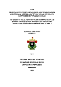 FIRMANSYAH, DEFRYANTO (2025) PENGARUH KARAKTERISTIK KETUA KOMITE AUDIT DAN MANAJEMEN LABA TERHADAP MODIFIED AUDIT OPINION DENGAN KEPEMILIKAN INSTITUSI SEBAGAI VARIABEL MODERASI = THE EFFECT OF CHARACTERISTICS AUDIT COMMITTEE CHAIR AND EARNING MANAGEMENT ON MODIFIED AUDIT OPINION WITH INSTITUTIONAL OWNERSHIP AS A MODERATING VARIABLE. Thesis thesis, Universitas Hasanuddin.