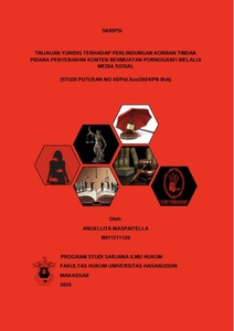 ABSTRAK ANGELLITA MASPAITELLA (B011211120). Tinjauan Yuridis Terhadap Perlindungan Korban Tindak Pidana Penyebaran Konten Bermuatan Pornografi Melalui Media Sosial (Studi Putusan Nomor 45/Pid.Sus/2024/PN Bsk). Dibimbing oleh Nur Azisa sebagai Pembimbing. Latar Belakang: Penyebaran konten bermuatan pornografi melalui media sosial merupakan bentuk kejahatan siber yang memiliki dampak serius, baik secara psikologis, sosial, maupun ekonomi terhadap korban, terutama jika dilakukan dengan motif balas dendam (revenge porn). Perlindungan terhadap korban dalam sistem peradilan pidana Indonesia kerap kali belum maksimal, karena lebih berorientasi pada penghukuman pelaku. Tujuan: Penelitian ini bertujuan untuk menganalisis bentuk perlindungan hukum terhadap korban dalam kasus penyebaran konten bermuatan pornografi melalui media sosial dan mengevaluasi hambatan aparat penegak hukum berdasarkan Putusan Nomor 45/Pid.Sus/2024/PN Bsk. Metode: Penelitian ini merupakan penelitian hukum normatif dengan pendekatan perundang-undangan dan pendekatan kasus. Sumber bahan hukum terdiri dari bahan hukum primer (peraturan perundang-undangan dan putusan pengadilan), sekunder (literatur dan dokumen hukum), serta bahan non-hukum. Teknik pengumpulan data dilakukan melalui studi kepustakaan dan dianalisis secara preskriptif-normatif. Hasil: Penelitian menemukan bahwa (1) Perlindungan korban dalam kasus penyebaran konten pornografi melalui media sosial masih terbatas pada aspek normatif, sehingga belum mampu menjawab kebutuhan korban secara menyeluruh. (2) Putusan No. 45/Pid.Sus/2024/PN Bsk hanya berfokus pada pemidanaan pelaku, tanpa mengakomodasi hak-hak korban seperti restitusi, rehabilitasi, dan penghapusan konten digital. Hambatan utama terletak pada lemahnya penerapan perspektif viktimologi, keterbatasan regulasi teknis, serta minimnya koordinasi antar-aparat penegak hukum. Kesimpulan: Perlindungan korban dalam tindak pidana penyebaran konten bermuatan pornografi melalui media sosial masih bersifat parsial dan formalistik, yang ditunjukkan dengan tidak dicantumkannya amar putusan mengenai penghapusan konten digital, perlindungan identitas, maupun pemulihan korban. Meskipun telah ada berbagai regulasi yang menjamin hak korban, implementasinya dalam putusan ini masih menempatkan korban sebagai saksi, bukan subjek yang harus dipulihkan.