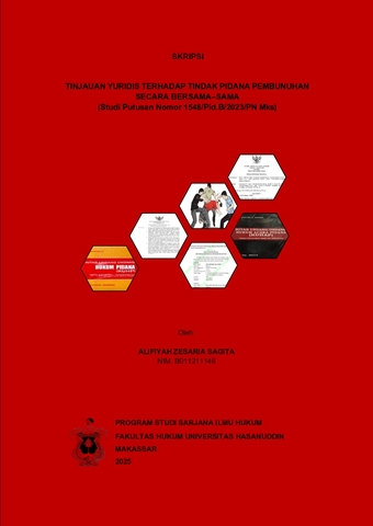 Alifiyah Zesaria Sagita (B011211146). TINJAUAN YURIDIS TERHADAP TINDAK PIDANA PEMBUNUHAN SECARA BERSAMA–SAMA (STUDI PUTUSAN NOMOR 1548/PID.B/2023/PN MKS). Dibimbing oleh Muh. Aris Munandar, sebagai Pembimbing. Latar belakang: Pembunuhan ialah salah satu tindakan yang melanggar hak-hak asasi manusia, dimana akibat dari tindak pidana pembunuhan yakni menghilangkan nyawa korban. Setiap kali terjadi pembunuhan, masyarakat merasa bahwa rasa aman mereka ikut dirampas. Alhasil, pengaturan pembunuhan dalam hukum pidana tidak hanya dimaksudkan untuk menghukum pelaku, tetapi juga untuk menjaga ketentraman dan ketrtiban sosial. Tujuan: Penelitian ini bertujuan untuk mengkaji penerapan hukum pidana materiil terhadap tindak pidana pembunuhan secara bersama–sama serta untuk menganalisis pertimbangan hukum hakim ketika menetapkan sanksi pidana. Metode: Penelitian ini menerapkan metodologi penelitian hukum normatif melalui pendekatan perundang–undangan (statue approach) beserta pendekatan kasus (case approach), kemudian diolah melalui analisis dan dijelaskan secara deskriptif. Hasil: Penelitian ini memperlihatkan bahwasanya (1) tindak pidana pembunuhan yang dilakukan secara bersama-sama diatur dalam Pasal 338 KUHP jo. Pasal 55 ayat (1) ke-1 KUHP. Penerapan hukum pidana materiel dalam Putusan Nomor 1548/Pid.B/2023/PN Mks sudah menyesuaikan ketetapan hukum yang berlaku, dengan mempertimbangkan peran serta terdakwa dalam terjadinya tindak pidana; (2) dalam penjatuhan pidana, majelis hakim memperhatikan pertimbangan yuridis maupun non-yuridis. Pertimbangan tersebut digunakan untuk menilai kesesuaian perbuatan terdakwa dengan pendakwaan rumusan pasal oleh penuntut umum, sehingga terdakwa diputus bersalah melakukan tindak pidana pembunuhan secara bersama–sama sebagaimana dimaksud dalam Pasal 338 KUHP.
