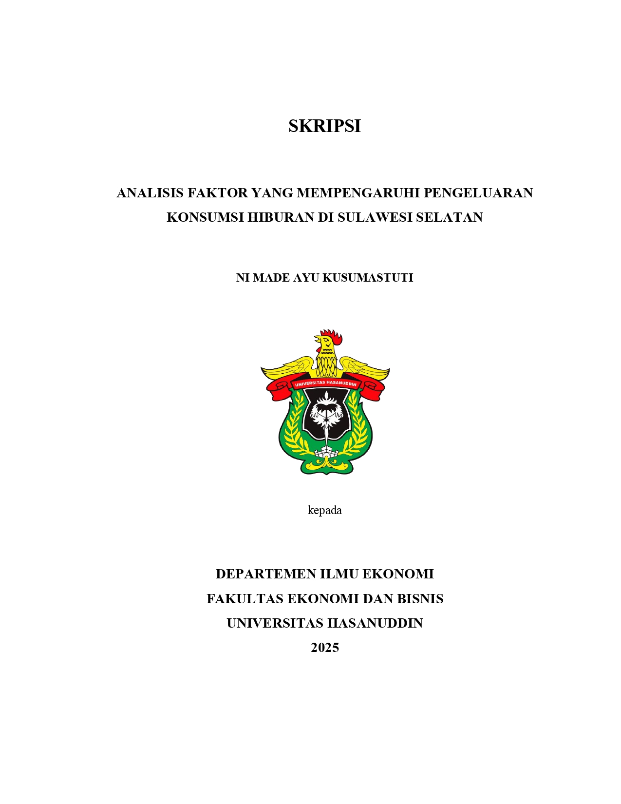 KUSUMASTUTI, NI MADE AYU (2025) ANALISIS FAKTOR YANG MEMPENGARUHI PENGELUARAN KONSUMSI HIBURAN DI SULAWESI SELATAN = ANALYSIS OF FACTORS AFFECTING ENTERTAINMENT CONSUMPTION EXPENDITURE IN SOUTH SULAWESI. Skripsi thesis, Universitas Hasanuddin.