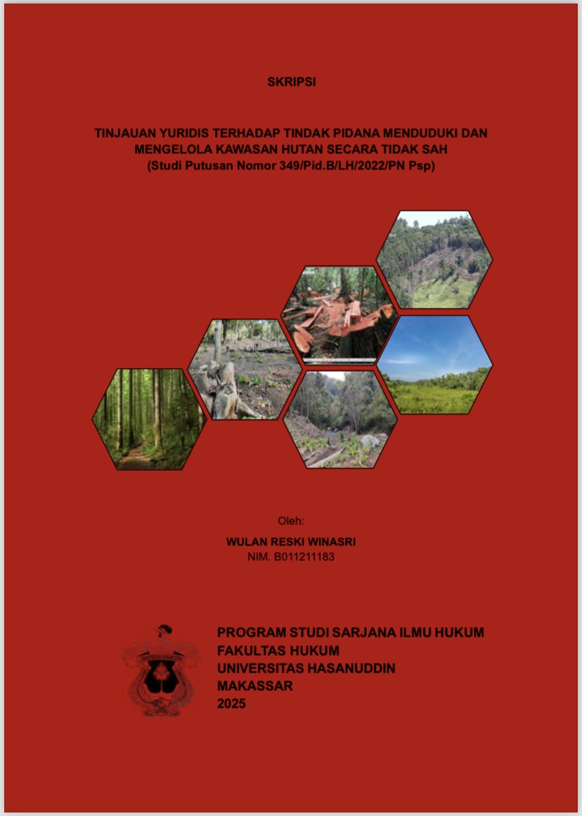 WINASRI, WULAN RESKI (2025) Tinjauan Yuridis Terhadap Tindak Pidana Menduduki dan Mengelola Kawasan Hutan Secara Tidak Sah (Studi Putusan Nomor 349/Pid.B/LH/2022/PN Psp) = A Juridicial Review of the Criminal Act of Illegal Enroachment on Forest Areas (Case Study of Decision Number 349/Pid.B/LH/2022/PN Psp). Skripsi thesis, UNIVERSITAS HASANUDDIN MAKASSAR.