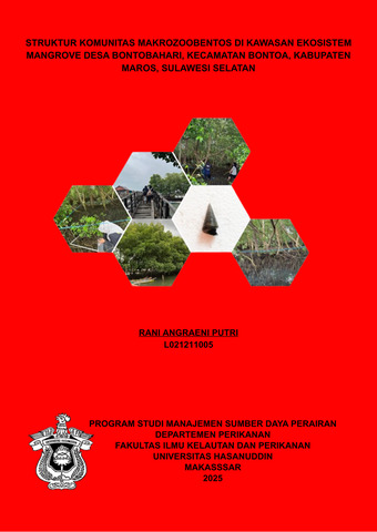 RANI ANGRAENI PUTRI. Struktur Komunitas Makrozoobentos Di Kawasan Ekosistem Mangrove Desa Bontobahari, Kecamatan Bontoa, Kabupaten Maros, Sulawesi Selatan. Dibimbing oleh Nita Rukminasari. Latar Belakang. Mangrove menjaga ekosistem pesisir dan menjadi habitat bagi makrozoobentos, indikator alami kualitas perairan. Di Kecamatan Bontoa, Kabupaten Maros, luas mangrove menurun akibat aktivitas manusia, yang berdampak pada keanekaragaman makrozoobentos. Tujuan. Tujuan dari penelitian ini adalah untuk mengetahui struktur komunitas Makrozoobentos, mengidentifikasi jenis-jenis makrozoobentos dan Menganalisis struktur komunitas makrozoobentos, meliputi kelimpahan, kelimpahan relatif, keanekaragaman, dominansi, dan keseragaman di desa Bontobahari, Kecamatan Bontoa. Metode. Penelitian ini dilaksanakan pada bulan Mei hingga Juni 2025. Sampel yang didapatkan lalu dI dentifikasi dilakukan dengan membandingkan morfologi sampel dengan referensi pada buku identifikasi.. Seluruh data hasil penelitian dianalisis menggunakan program Microsoft Excel versi 2010. Hasil. Ditemukan total 8 spesies makrozoobentos dari 5 ordo dan 5 famili yang tersebar di tiga stasiun pengamatan. Dengan total jumlah individu sebanyak 407. Stasiun II memiliki jumlah spesies terbanyak yaitu 8 spesies, sedangkan Stasiun I dan III masing-masing hanya ditemukan 3 spesies. Indeks ekologi yang diamati adalah, Indeks Keanekaragaman, indkes keseragaman, dan indeks dominansi. Kesimpulan. Penelitian di mangrove Desa Bontobahari menemukan 8 spesies makrozoobentos 407 individu, dominan Telescopium telescopium. Stasiun II paling stabil, sementara faktor lingkungan seperti suhu, salinitas, dan pH yang di luar baku mutu menunjukkan tekanan terhadap kualitas habitat. Struktur komunitas cukup seimbang tanpa perbedaan signifikan antar stasiun.