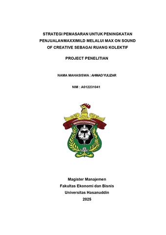 AHMAD YULIZAR, A012231041. STRATEGI PEMASARAN UNTUK PENINGKATAN PENJUALAN MAXXIMILD MELALUI MAX ON SOUND FO CREATIVE SEABAGAI RUANG KOLEKTIF. Penelitian ini berjudul "Strategi Pemasaran untuk Peningkatan Penjualan Maxximild melalui Max On Sound Of Creative sebagai Ruang Kolektif" bertujuan untuk menganalisis dan merumuskan strategi pemasaran yang efektif dalam meningkatkan penjualan produk Maxximild. Dalam konteks persaingan yang ketat di industri rokok, penelitian ini mengidentifikasi berbagai masalah yang dihadapi, termasuk kurangnya ruang kolektif untuk penggiat seni dan musisi, tantangan dalam mendapatkan pembiayaan, serta perubahan perilaku konsumen. Dengan menggunakan analisis SWOT, PEST, dan lima kekuatan Porter, penelitian ini mengeksplorasi faktor internal dan eksternal yang mempengaruhi bisnis. Rekomendasi yang dihasilkan mencakup pemanfaatan ruang kolektif untuk promosi, kolaborasi dengan penggiat seni, dan penggunaan media sosial. Penelitian ini diharapkan dapat memberikan kontribusi positif bagi pengembangan strategi bisnis Max On Sound Of Creative dan meningkatkan daya saing produk Maxximild di pasar.