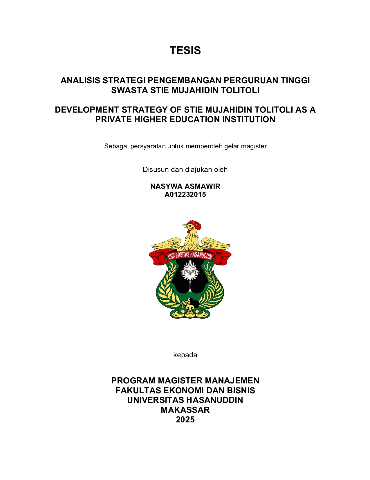 ASMAWIR, NASYWA (2025) ANALISIS STRATEGI PENGEMBANGAN PERGURUAN TINGGI SWASTA STIE MUJAHIDIN TOLITOLI = DEVELOPMENT STRATEGY OF STIE MUJAHIDIN TOLITOLI AS A PRIVATE HIGHER EDUCATION INSTITUTION. Thesis thesis, Universitas Hasanuddin.