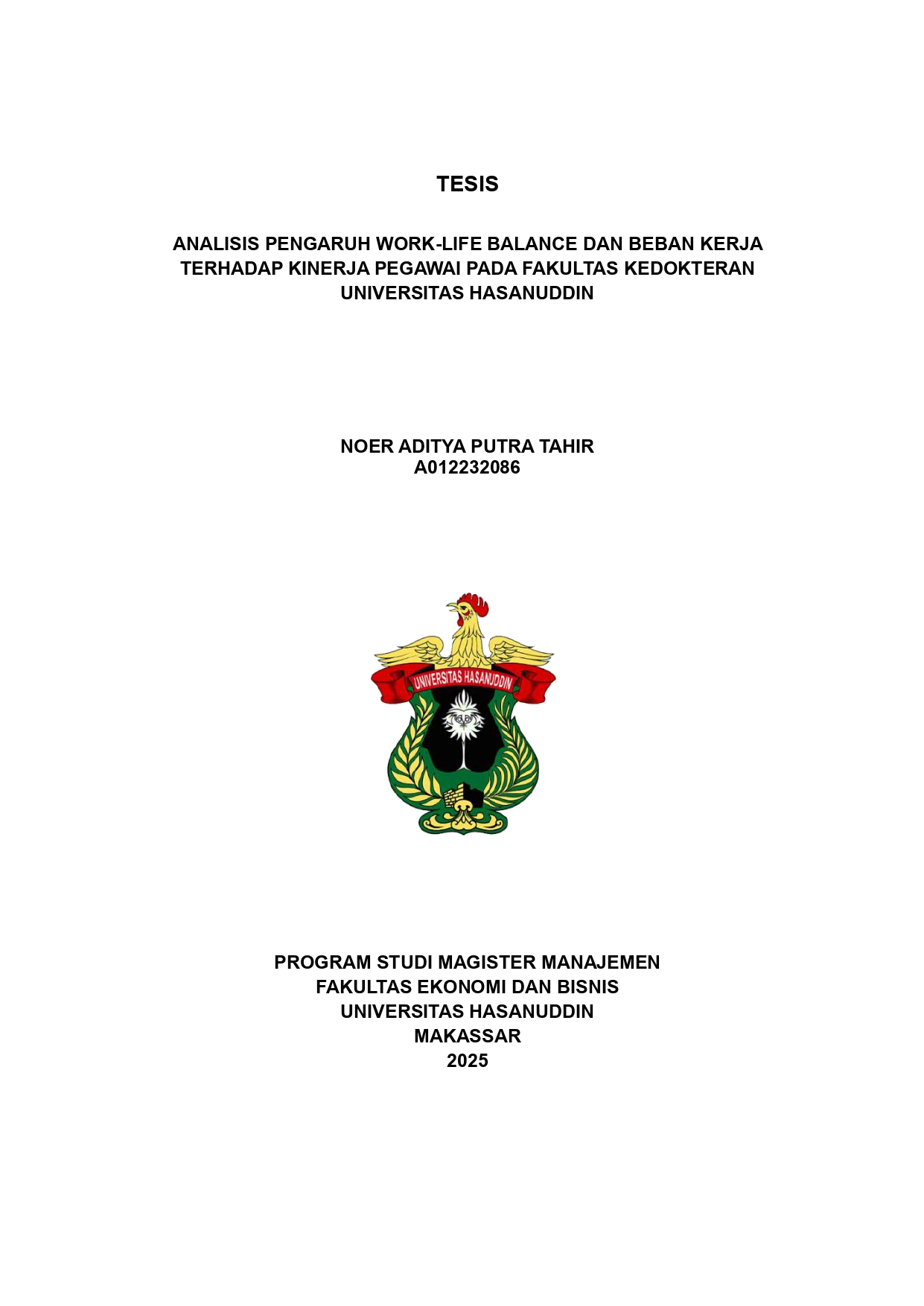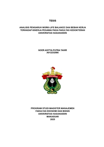NOER ADITYA PUTRA TAHIR. Analisis Pengaruh Work-Life Balance dan Beban Kerja Terhadap Kinerja Pegawai Fakultas Kedokteran Universitas Hasanuddin (Dibimbing Oleh Rahman Kadir) Penelitian ini mengkaji pengaruh keseimbangan kerja-kehidupan dan beban kerja yang dirasakan terhadap kinerja staf administrasi di Fakultas Kedokteran, Universitas Hasanuddin. Desain kuantitatif deskriptif dengan pendekatan survei digunakan, melibatkan 50 responden yang dipilih melalui sampling purposif. Responden mewakili karakteristik yang beragam dalam hal jenis kelamin, usia, pendidikan, jabatan, dan lama bekerja. Analisis deskriptif menunjukkan bahwa keseimbangan kerja-kehidupan dan kinerja karyawan berada pada tingkat tinggi, sementara beban kerja berada pada tingkat sedang dengan distribusi skor yang lebih luas. Keandalan instrumen dikonfirmasi melalui Cronbach's alpha, dan asumsi regresi terpenuhi. Analisis regresi linier berganda menunjukkan bahwa keseimbangan kerja-kehidupan memiliki pengaruh positif dan signifikan terhadap kinerja karyawan (β=0.230, p=0.046), sementara beban kerja tidak memiliki pengaruh yang signifikan (β=0.041, p=0.637). Temuan ini menyarankan bahwa strategi untuk meningkatkan kinerja karyawan sebaiknya fokus pada pengembangan keseimbangan kerja-kehidupan daripada hanya mengelola beban kerja. Studi ini menyoroti pentingnya menciptakan lingkungan kerja yang mendukung yang mempromosikan harmoni antara kehidupan profesional dan pribadi karyawan untuk mengoptimalkan produktivitas dan kesejahteraan dalam konteks institusi pendidikan tinggi. Kata kunci : Keseimbangan kerja-kehidupan, Beban kerja, Kinerja karyawan, Pendidikan tinggi, Staf administrasi.