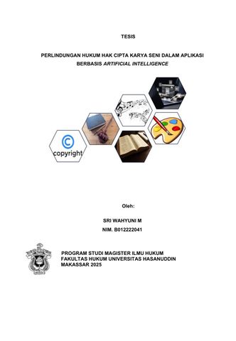 Sri Wahyuni M (B012222041). Perlindungan Hukum Hak Cipta Karya Seni Dalam Aplikasi Berbasis Artificial Itelligence. Di bawah bimbingan Judhariksawan. Penelitian ini bertujuan menganalisis konsep perlindungan hukum terhadap hak cipta karya seni yang digunakan oleh aplikasi kecerdasan buatan dan penegakan hukum terhadap pelanggaran hak cipta karya seni dalam penggunaan aplikasi berbasis kecerdasan buatan. Penelitian ini menggunakan metode penelitian normatif, yang objek kajiannya berdasarkan pada ketentuan perundang-undangan. Jenis pendekatan yang digunakan adalah pendekatan perundang-undangan, pendekatan konsep, dan pendekatan sejarah. Jenis dan sumber bahan hukum yang digunakan adalah bahan hukum primer, bahan hukum sekunder, dan bahan hukum tersier. Teknik pengumpulan bahan hukum dilakukan dengan teknik penelitian kepustakaan. Bahan hukum yang diperoleh selanjutnya dianalisis secara kualitatif dan disajikan secara preskriptif. Hasil penelitian ini menunjukkan bahwa konsep perlindungan hukum terhadap hak cipta karya seni yang dihasilkan oleh kecerdasan buatan menghadapi berbagai tantangan dan kompleksitas. Pertama, terdapat ketidakjelasan mengenai subjek hak cipta, apakah pencipta adalah pengembang, pengguna, atau AI itu sendiri, karena undang-undang hak cipta saat ini tidak secara spesifik mengatur karya yang dihasilkan oleh kecerdasan buatan. Kedua, orisinalitas karya yang dihasilkan oleh AI menjadi perdebatan, mengingat bahwa orisinalitas adalah syarat penting untuk perlindungan hak cipta, namun definisi orisinalitas dalam undang- undang tidak cukup jelas. Ketiga, hak moral dan hak ekonomi juga menjadi isu, terutama dalam menentukan siapa yang berhak atas manfaat ekonomi dari karya yang dihasilkan oleh AI. Selain itu, regulasi yang belum memadai, tantangan dalam penegakan hukum, dan potensi penyalahgunaan data oleh AI menambah kompleksitas dalam perlindungan hak cipta. Oleh karena itu, diperlukan beberapa solusi untuk menciptakan kerangka hukum yang lebih akomodatif dan memberikan kepastian hukum bagi semua pihak yang terlibat. Penegakan hukum terhadap pelanggaran hak cipta karya seni dalam penggunaan aplikasi berbasis kecerdasan buatan di Indonesia belum memiliki regulasi yang mengaturnya secara khusus. Sejauh ini pertanggungjawaban hukum sepenuhnya dibebankan kepada pemilik atau pengembang dari teknologi kecerdasan buatan tersebut dengan memposisikan pelanggaran hak cipta oleh kecerdasan buatan sebagai delik aduan.