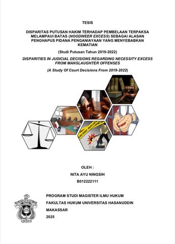 NITA AYU NINGSIH (B012222111). Disparitas Putusan Hakim Terhadap Pembelaan Terpaksa Melampaui Batas (Noodweer Excess) Sebagai Alasan Penghapus Pidana Penganiayaan Yang Menyebabkan Kematian (Studi Putusan Tahun 2019-2022). Di bawah bimbingan Slamet Sampurno Soewondo. Penelitian ini bertujuan untuk menganalisis faktor-faktor yang menyebabkan disparitas putusan hakim serta pertimbangan hukum apa yang diberikan Hakim dalam kasus Disparitas Putusan Hakim Terhadap Pembelaan Terpaksa Melampaui Batas (Noodweer Excess) Sebagai Alasan Penghapus Pidana Penganiayaan Yang Menyebabkan Kematian (Studi Putusan Tahun 2019-2022). Penelitian ini menggunakan metode penelitian hukum normatif yang objek kajiannya berdasarkan pada ketentuan perundang-undangan. Jenis pendekatan yang digunakan adalah pendekatan perundang-undangan, pendekatan konsep, dan pendekatan kasus. Jenis dan sumber bahan hukum yang digunakan adalah bahan hukum primer yang meliputi Kitab Undang-Undang Hukum Pidana (KUHP), Kitab Undang-Undang Hukum Acara Pidana (KUHAP), dan Putusan Pengadilan, dan bahan hukum sekunder yang meliputi buku-buku dan jurnal/artikel yang relevan dengan penelitian ini. Pengumpulan bahan hukum menggunakan teknik penelitian kepustakaan. Bahan hukum yang diperoleh selanjutnya dianalisis secara kualitatif dan disajikan secara preskriptif. Hasil penelitian ini menunjukkan bahwa disparitas putusan disebabkan oleh perbedaan penafsiran hakim karena beberapa faktor yaitu faktor internal hakim, faktor perilaku sosial hakim, faktor tindak pidananya, faktor usia terdakwa, faktor pengulangan tindak pidana atau residivis. Faktor-faktor tersebut menjadi alasan mengapa masih terjadi disparitas hakim dalam memutus suatu tindak pidana yang sama. Berkaitan dengan disparitas hakim dalam penerapan Noodweer Excess dalam tindak pidana penganiayaan yang mengakibatkan kematian, unsur pemenuhan tindak pidananya juga menjadi alasan utama hakim dalam menentukan berat ringannya hukuman yang diterima terdakwa. Selain itu unsur terhadap tekanan psikis yang hebat, perbedaan pertimbangan terhadap kondisi faktual kasus, serta subjektivitas dalam menerapkan asas keadilan. Selain itu, tidak adanya pedoman atau standar yang baku dalam menilai Noodweer Excess turut berkontribusi terhadap perbedaan putusan.